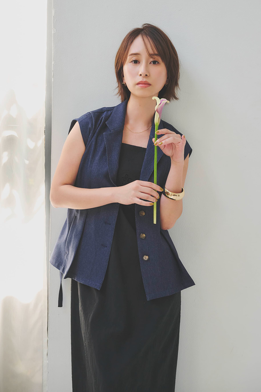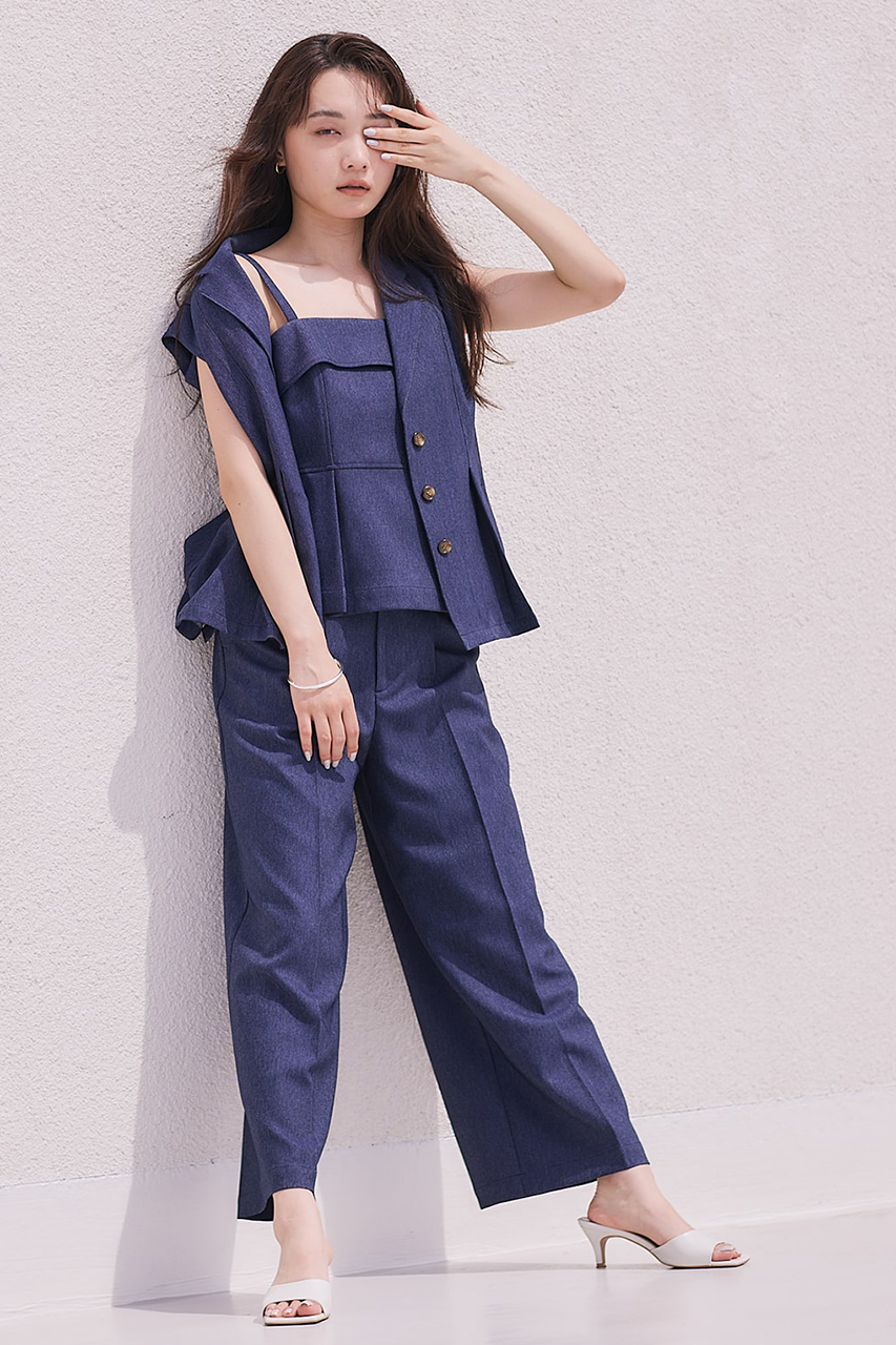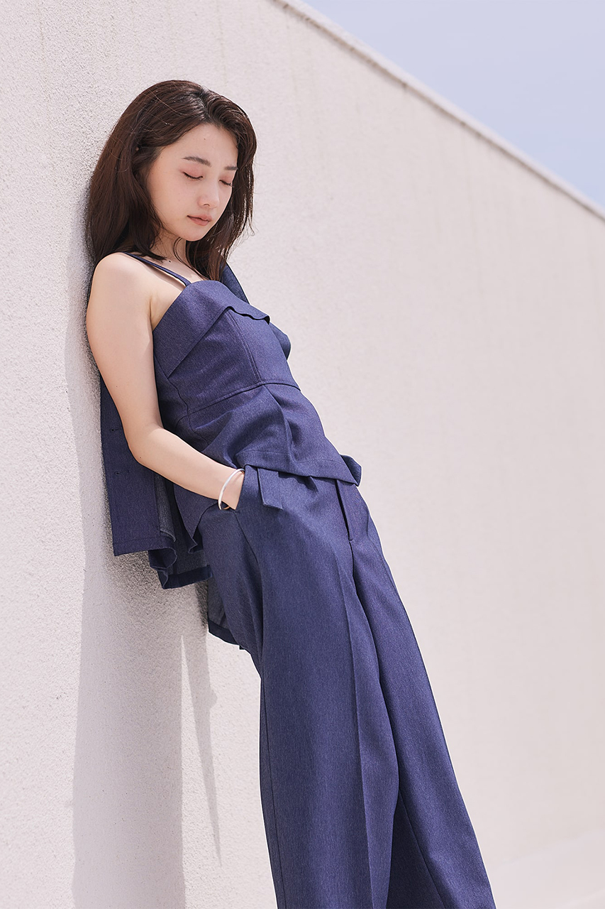 マニッシュなテーラードジレとビスチェ、ストンと落ちるワイドパンツのセットアップは、軽やかでこなれたムードが魅力。きちんと感と快適さ、どちらも叶える夏の味方です。デニム見えする素材ながら色落ちせず、接触冷感とストレッチ性を備えた快適な着心地も嬉しいポイント。さらりと羽織るだけで品よく決まり、ベルトでウエストマークすればスタイルアップも。休日も仕事の日も、頼れる2ピースとしてワードローブを支えてくれる存在です。