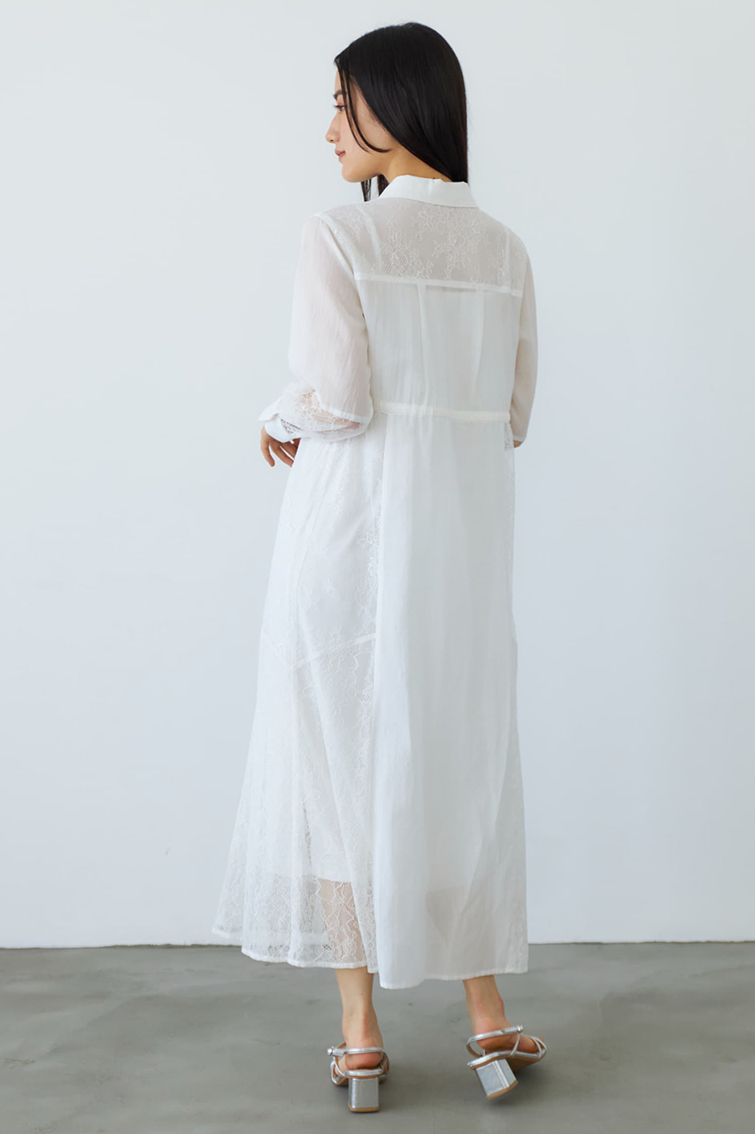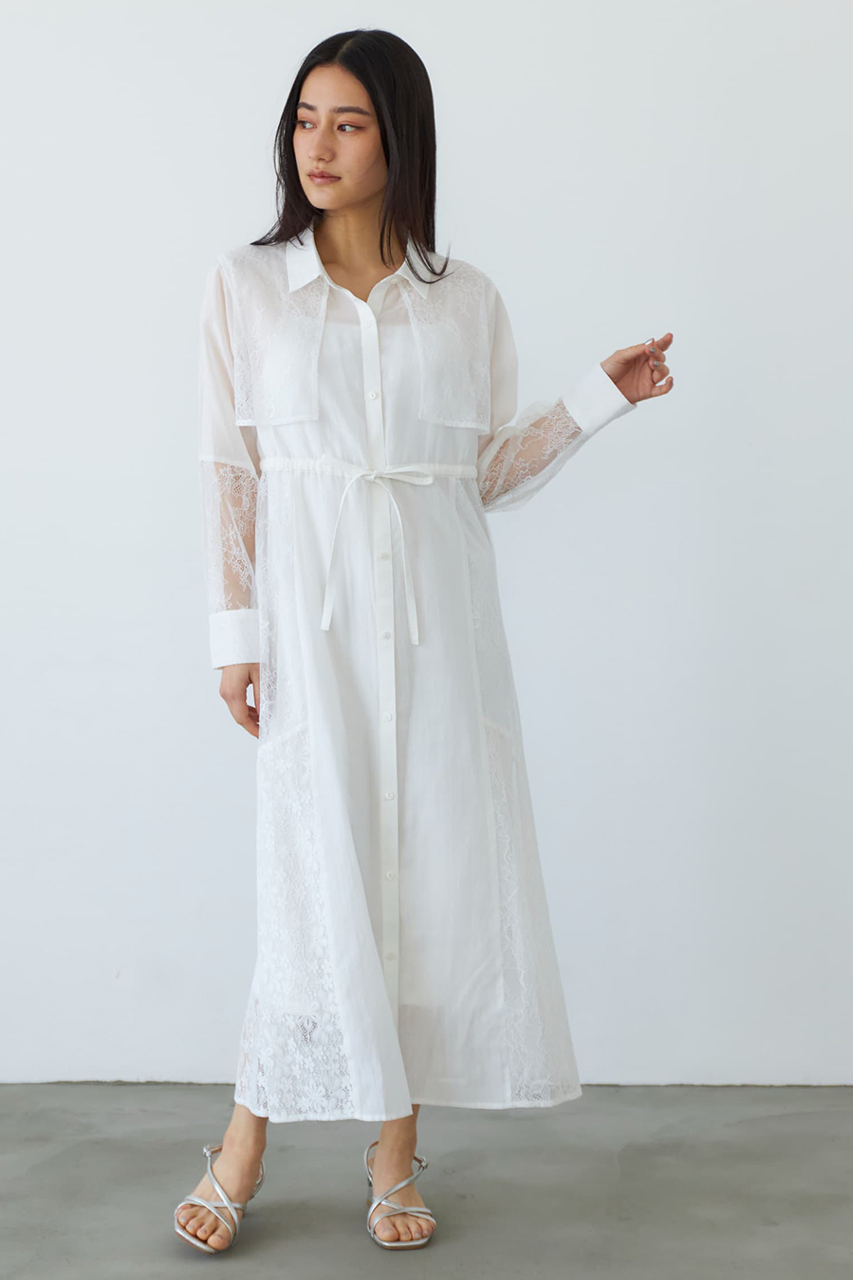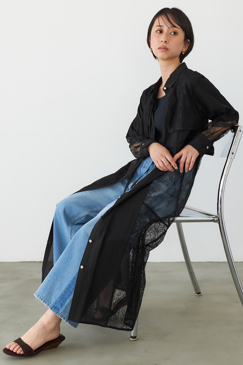 繊細な異素材レースを贅沢に組み合わせたシャツワンピースは、軽やかで奥行きのある表情が魅力。ソフトな肌あたりと高めのウエスト切り替えで、ロング丈でもすっきりと着映えが叶います。