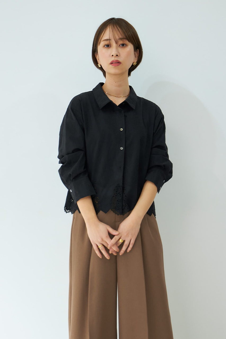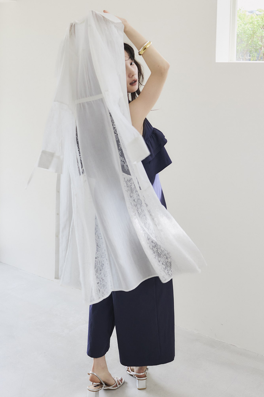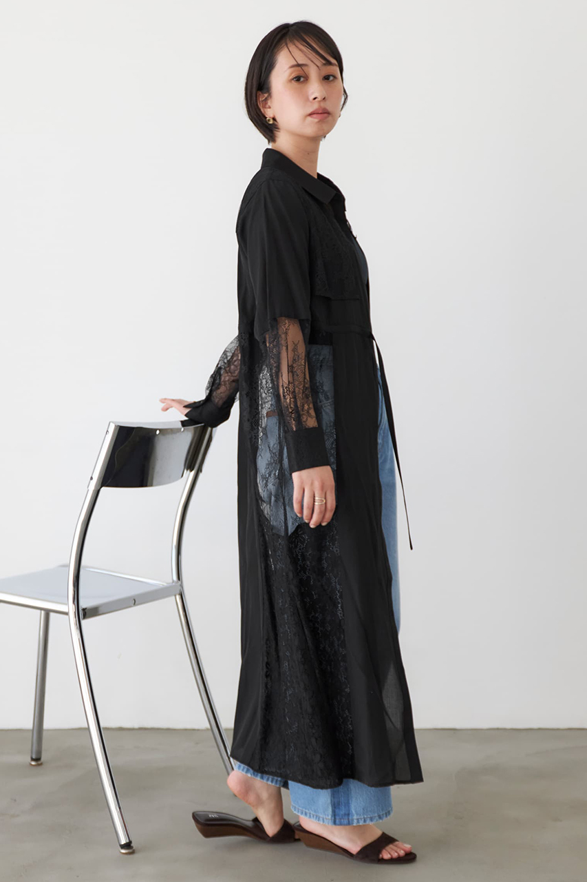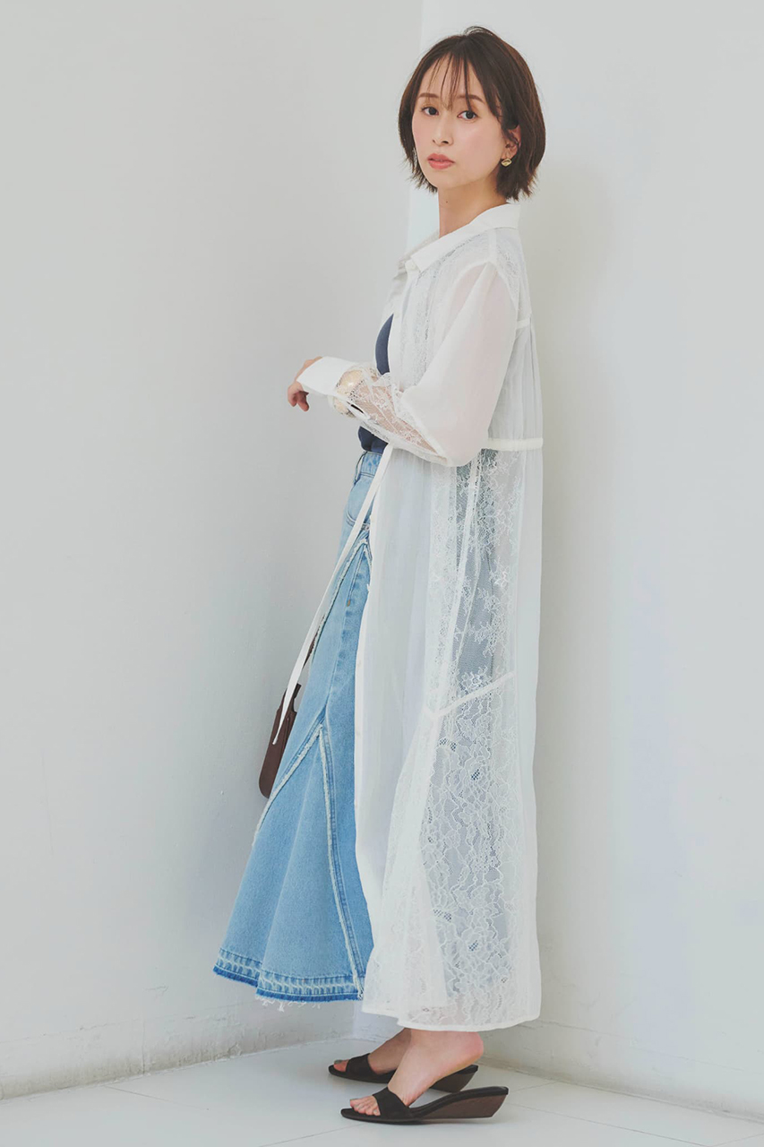 繊細な異素材レースを贅沢に組み合わせたシャツワンピースは、軽やかで奥行きのある表情が魅力。ソフトな肌あたりと高めのウエスト切り替えで、ロング丈でもすっきりと着映えが叶います。