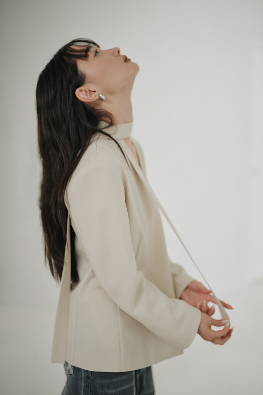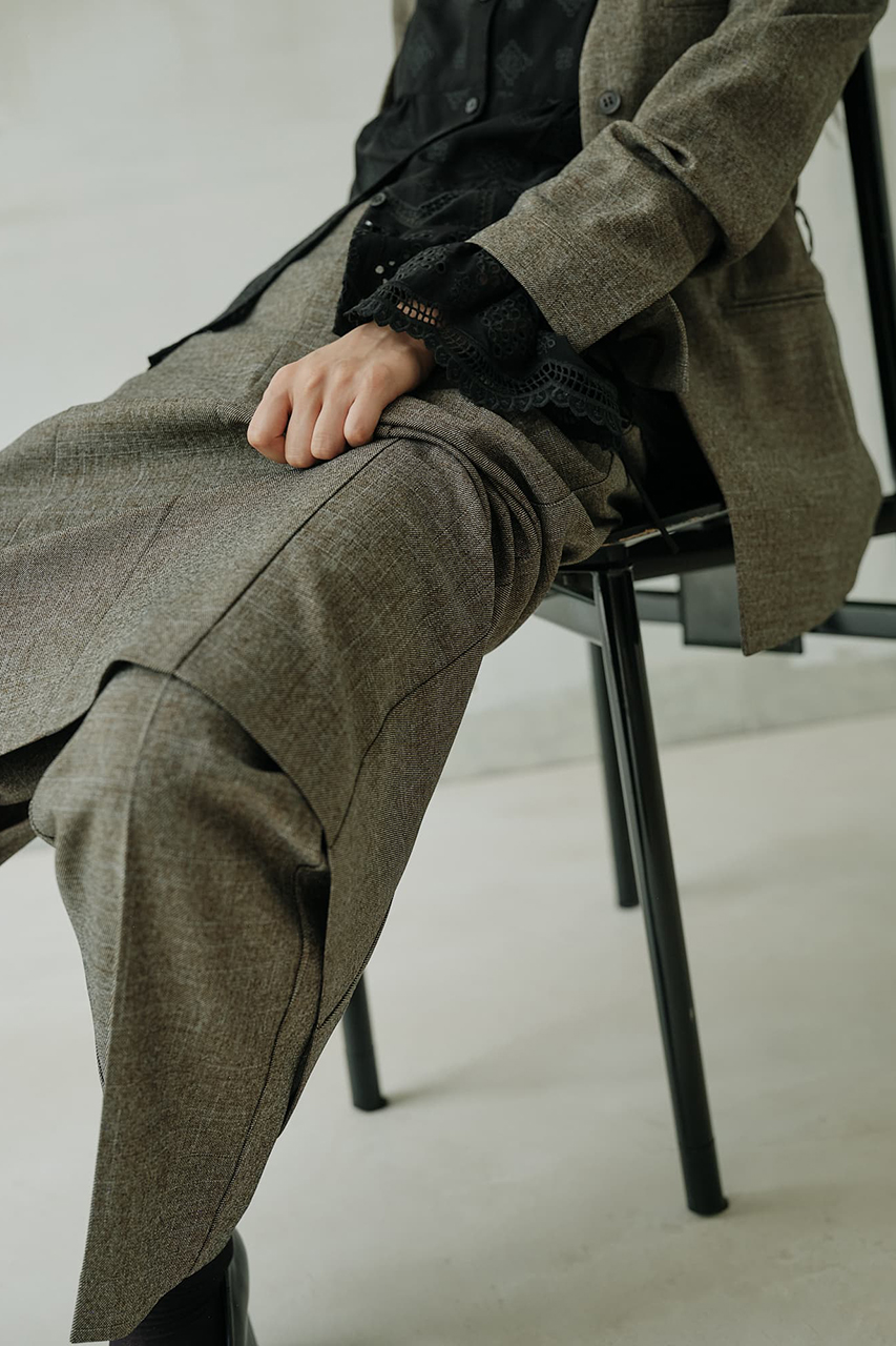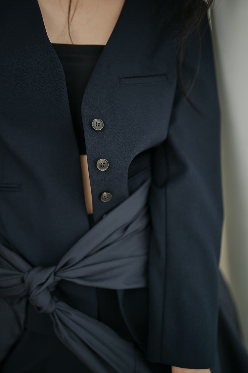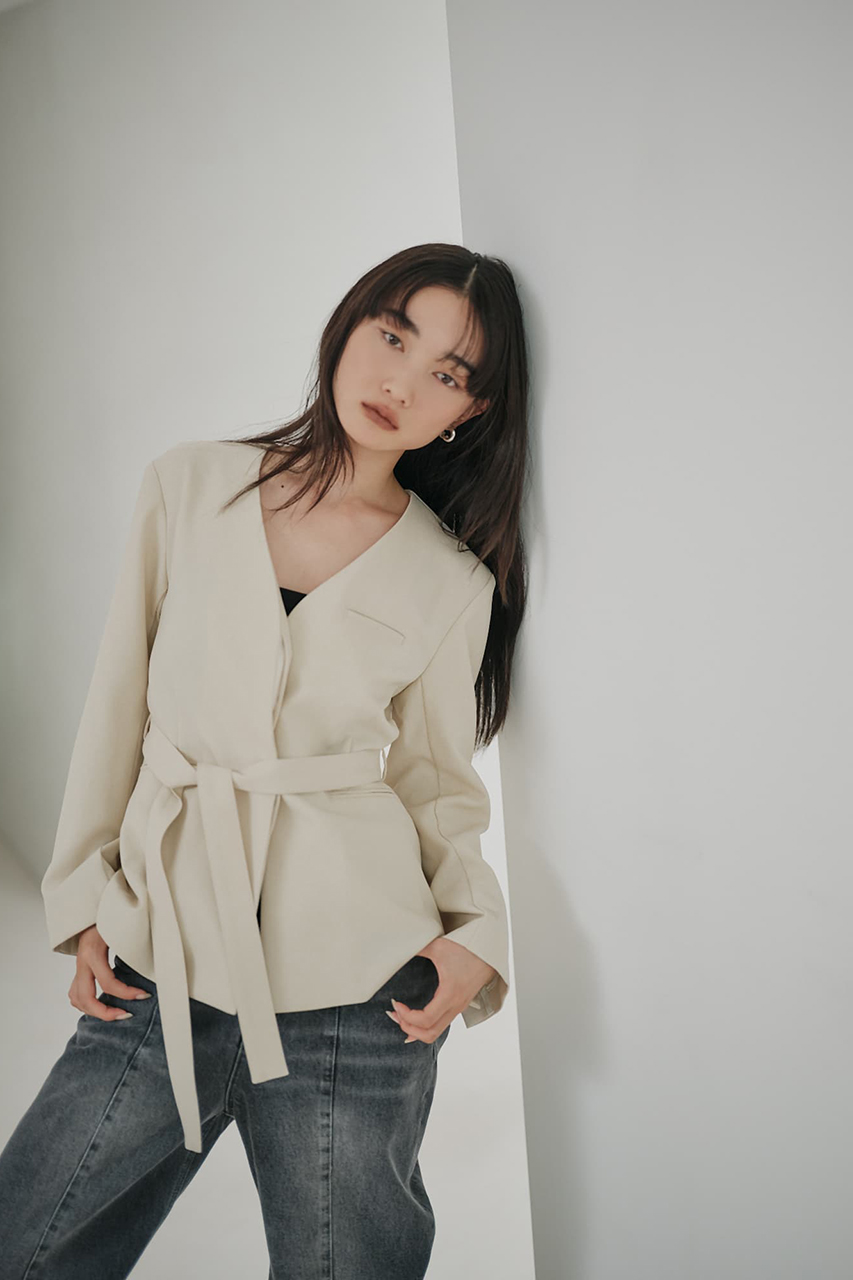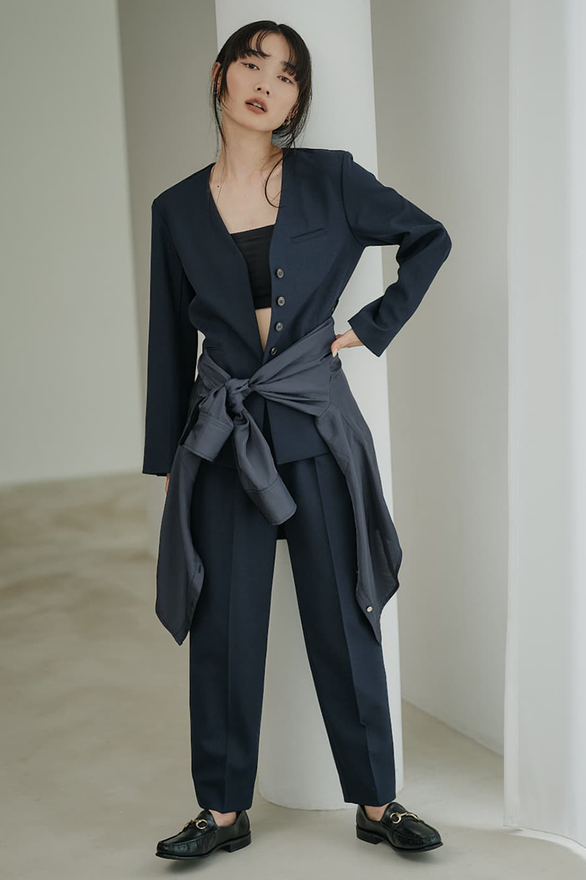 ほんのりウエストをシェイプしたレディライクなシルエットが魅力のノーカラージャケット。比翼仕立てでミニマルに仕上げつつ、ウエストベルトでスタイルアップも叶います。ウール調合繊素材はツイードライクな表情ながら軽やかで、シワになりにくくロングシーズン活躍。ナチュラルな伸縮性と快適な着心地も嬉しいポイント。セットアップでマニッシュに、ブラウスを合わせてフェミニンに幅広くスタイリング可能。同素材のパンツとスカートのご用意も。