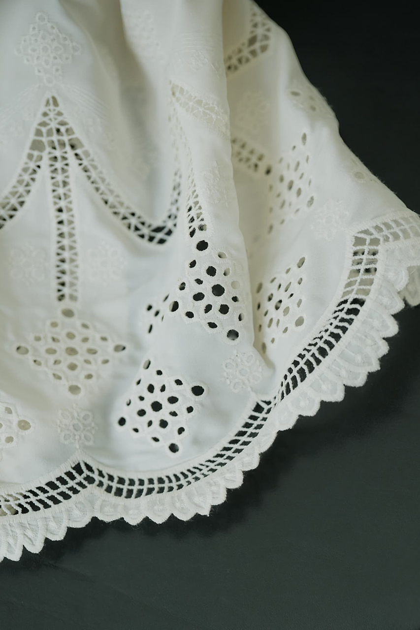 小柄さんに合わせた「エストラータ」オリジナルの繊細な総柄刺しゅうが目を引く、1枚で主役になる特別なブラウス。シャツカラー×Vネックで甘さを抑えつつ抜け感を演出。袖口と裾のスカラップ刺しゅうがクラフト感を添え、着映え力抜群。同素材のオールインワンは、ウエストよりも高めに設定した切り替え位置でスタイルUP効果も。共布リボンも付いているのでウエストマークも可能です。セットになったスカーフは腰や胸に巻いたり、単品使いでデニムなどのコーデに合わせて巻いても◎。