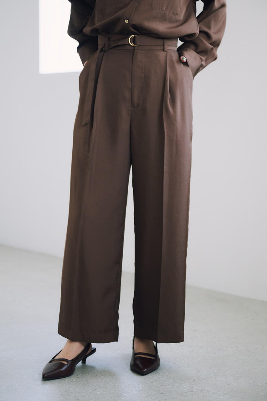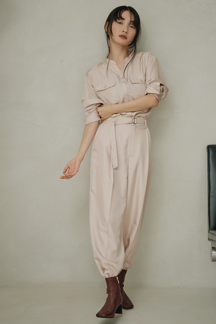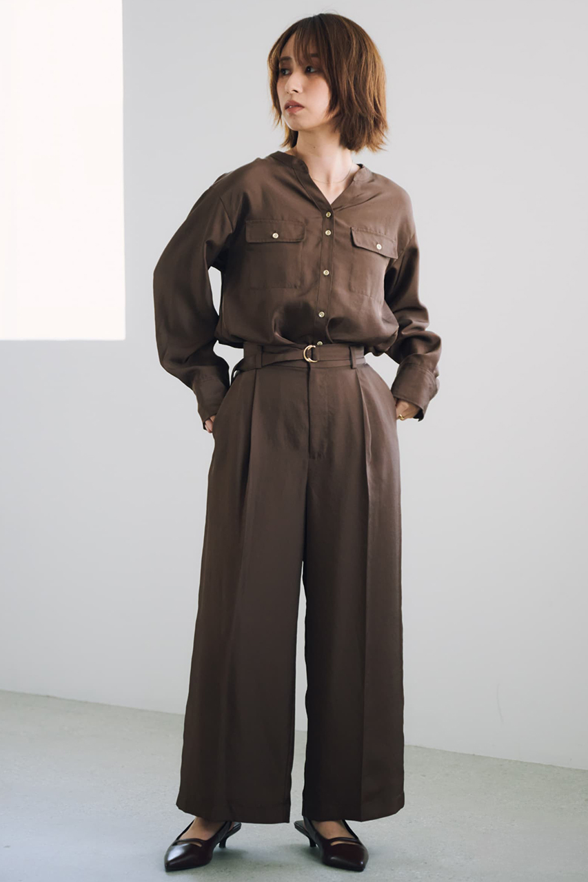 上品な艶と落ち感のあるツイル素材を使用した、シャツとワイドパンツのセットアップ。シャツはスキッパーネックとゴールドボタンで抜け感を添えつつ、羽織りとしても使える汎用性の高いデザイン。パンツはタックと共布ベルトでスタイルアップを叶え、後ろウエストゴムで快適な着心地に。リサイクルポリエステルを38%使用したサステナブルな素材で、ロングシーズン活躍。セットでの着用はもちろん、それぞれ単品でも幅広いシーンにフィットします。