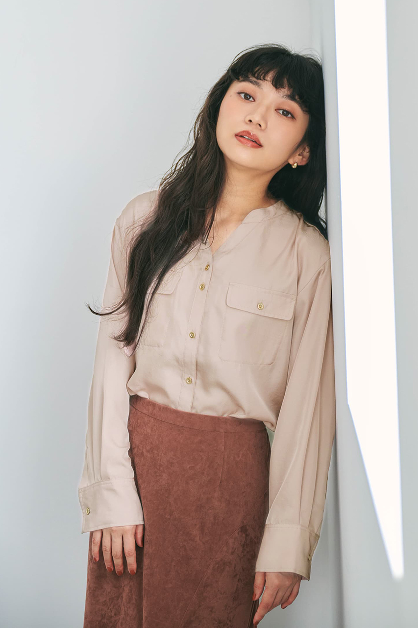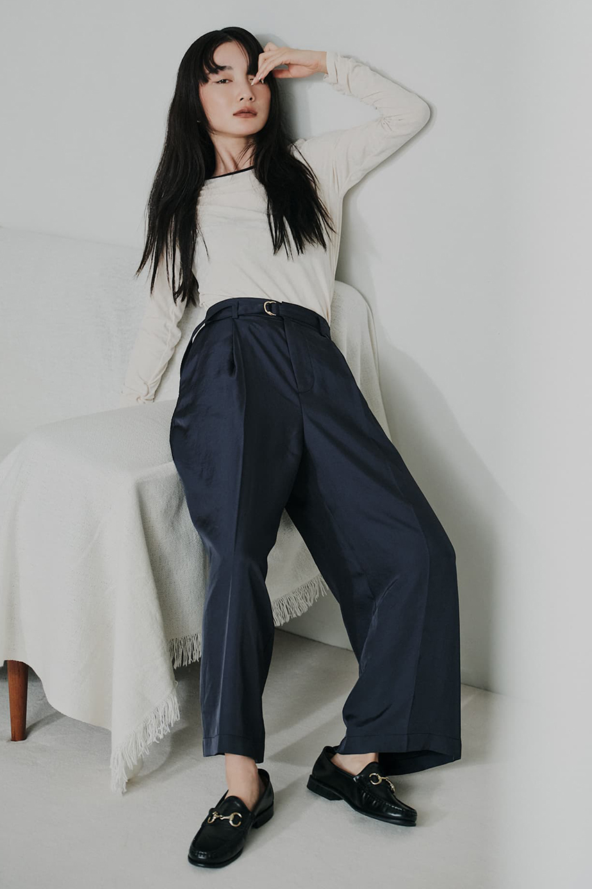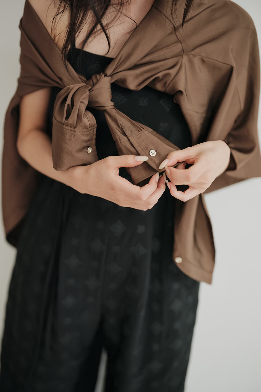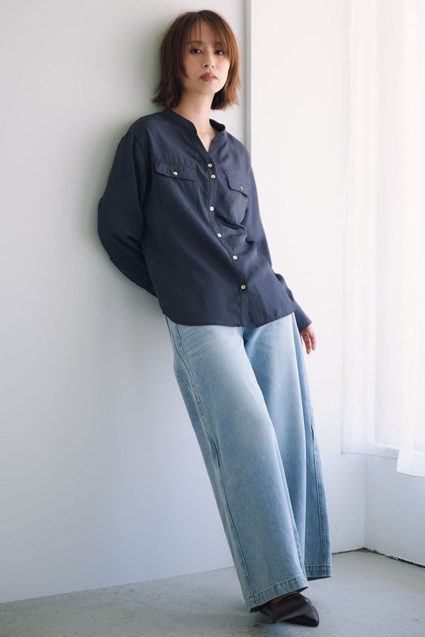 上品な艶と落ち感のあるツイル素材を使用した、シャツとワイドパンツのセットアップ。シャツはスキッパーネックとゴールドボタンで抜け感を添えつつ、羽織りとしても使える汎用性の高いデザイン。パンツはタックと共布ベルトでスタイルアップを叶え、後ろウエストゴムで快適な着心地に。リサイクルポリエステルを38%使用したサステナブルな素材で、ロングシーズン活躍。セットでの着用はもちろん、それぞれ単品でも幅広いシーンにフィットします。