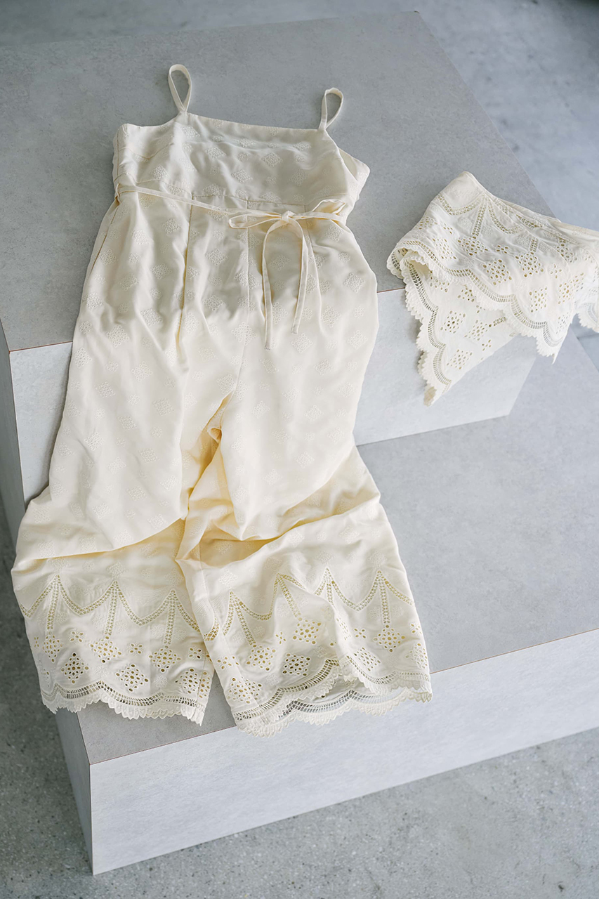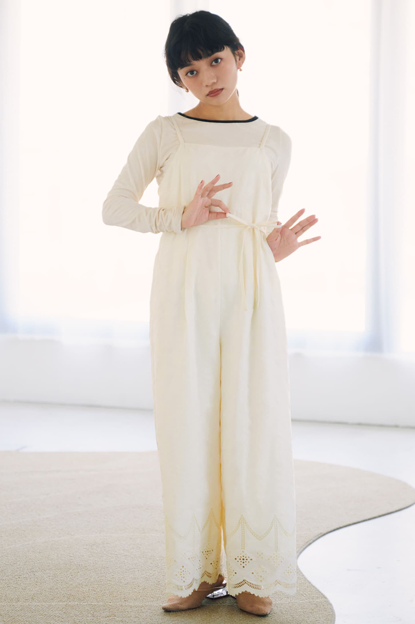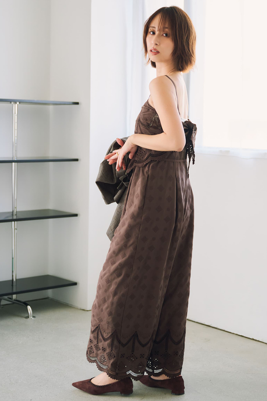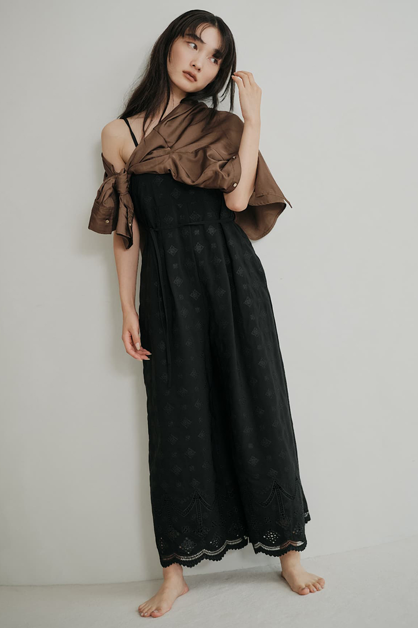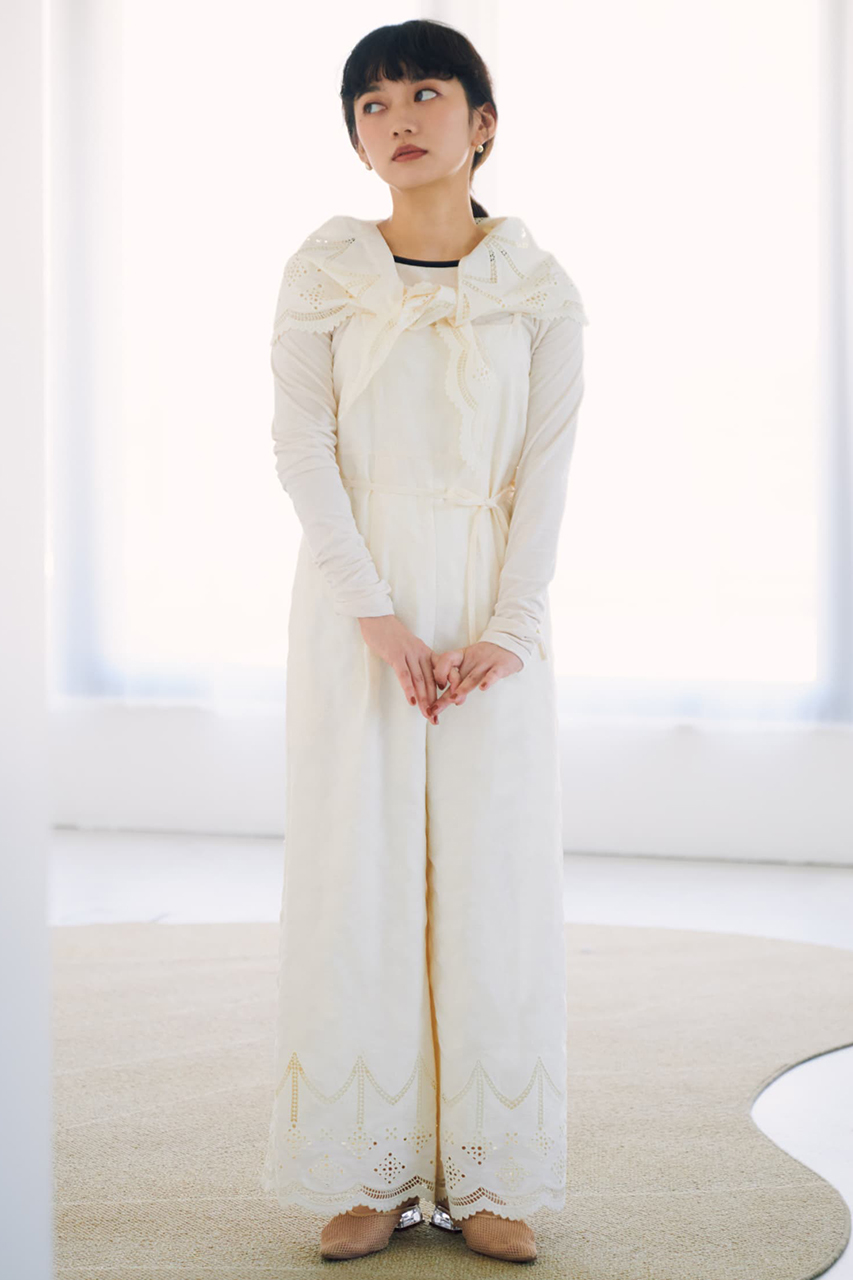 総柄刺しゅうが華やかに映える主役級オールインワン。高めの切り替え位置と共布リボンでスタイルアップが叶い、総裏仕立てで安心感のある着心地です。適度に肉厚なデシン素材に、「エストラータ」だけのオリジナル図案刺しゅうを施したスペシャルピース。セットのスカーフは腰や胸に巻いたり、デニムに合わせて単品使いしたり、着こなしに旬のアクセントをプラス。インナーや羽織を重ねれば、ロングシーズン活躍する万能アイテムです。
