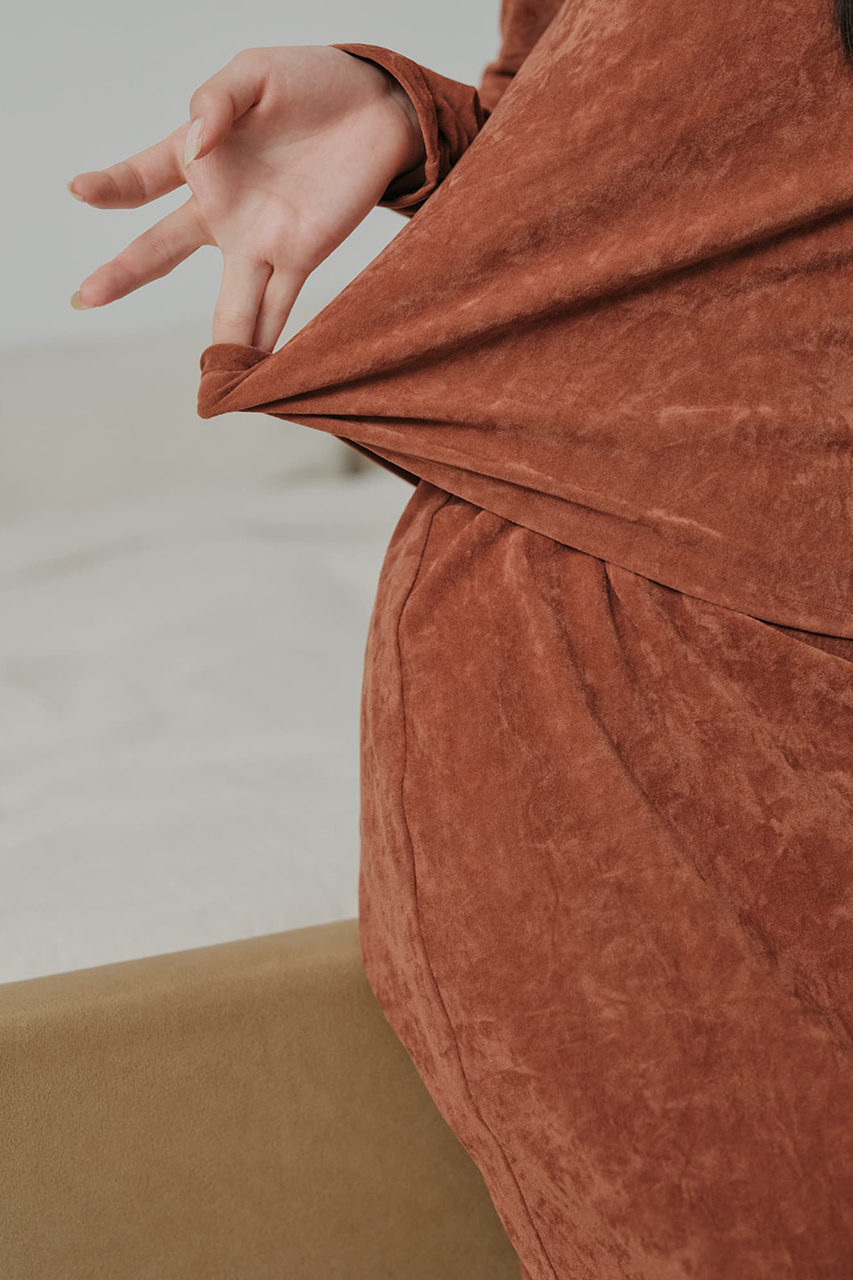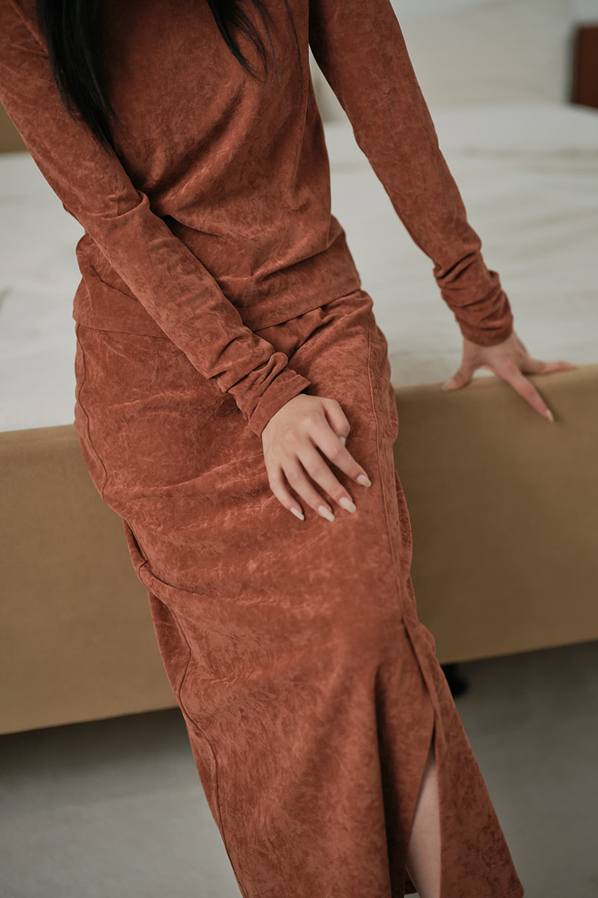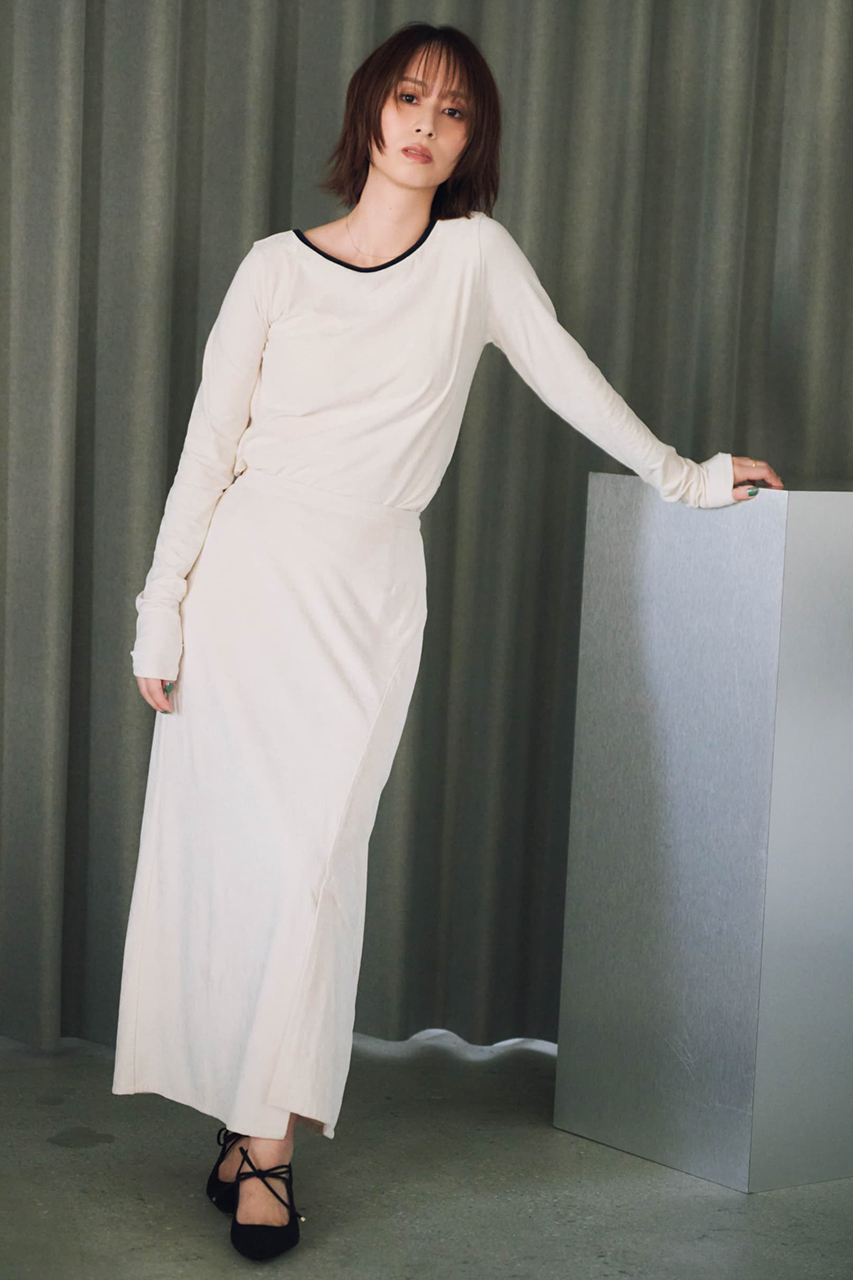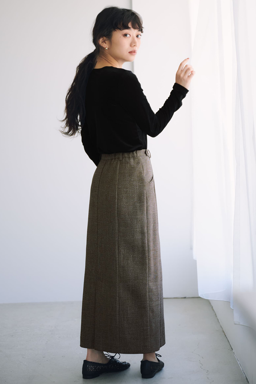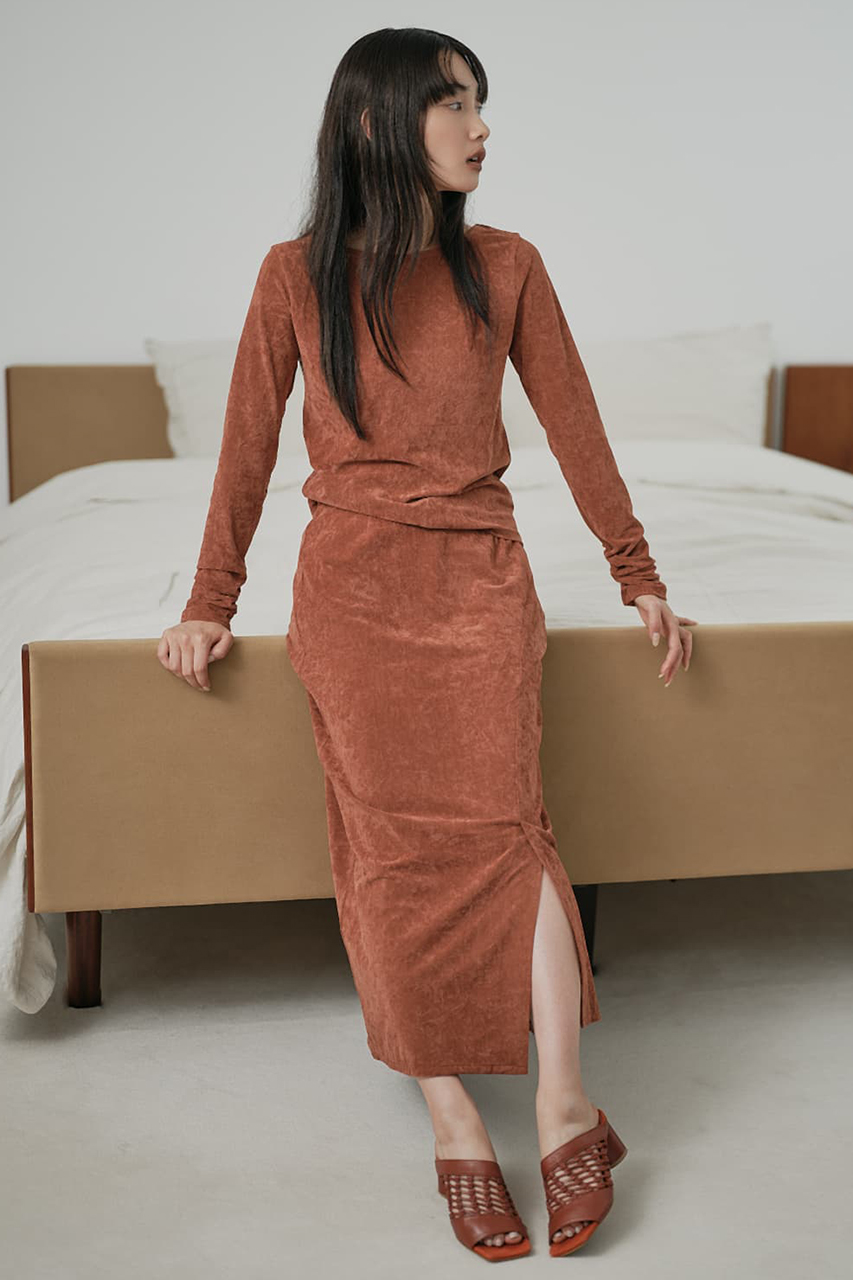 マットな光沢をたたえたベロア素材が上品に映える、トップスとスカートのセットアップ。トップスはすっきりとしたボートネックとバックリボンが女性らしさを引き立て、コンパクトながら快適な着心地。スカートはアシンメトリーの切り替えや段差ベンツで動きを出しつつ、ナローシルエットが美しく脚を演出。柔らかくストレッチの効いた軽やかな素材は日常から特別なシーンまで寄り添い、単品でも、セットで着ても洗練されたスタイルが完成します。