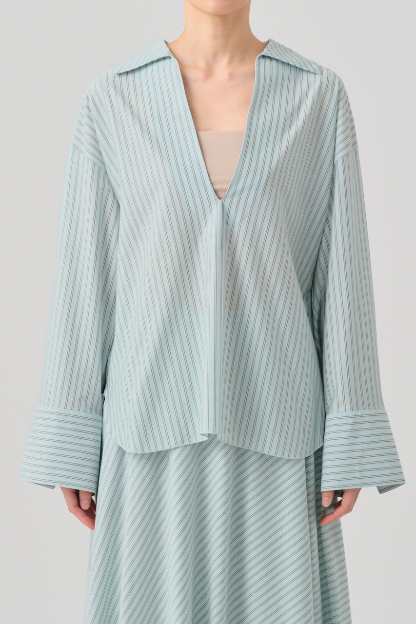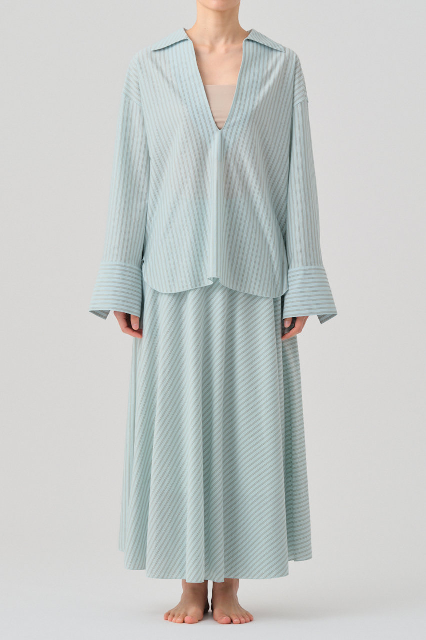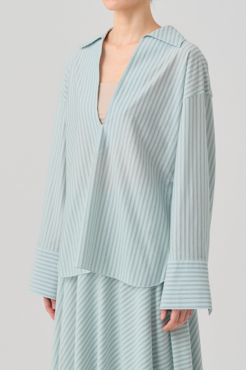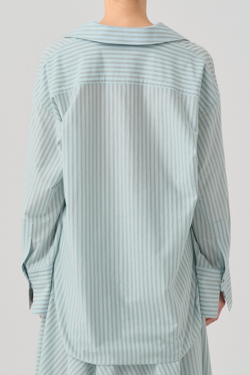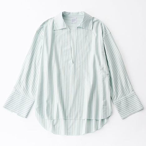 オーセンティックなダブルストライプ柄が印象的な、オーバーサイズのスキッパーカラーシャツ。国内では希少な、数台しかない46ゲージの編み機によって作られる生地は、細番手ならではの上品な光沢感があり、布帛のようなハリとカットソーならではの快適な伸縮性が特徴。特殊ミシン(Mlock®)を使い、縫い合わせる時に必要な縫い代を極限まで細くする事で、素材の良さを引き出し、見た目にも美しく、着心地の軽さ、快適さを追求。深めのVラインやボリュームスリーブ、ゆとりのあるボディが、抜け感のあるスタイリングを叶えてくれそう。