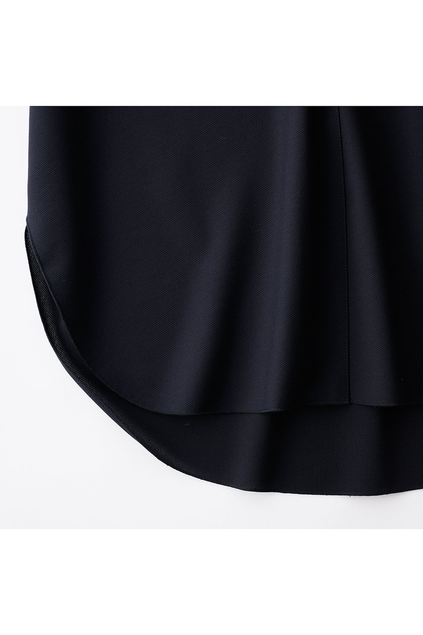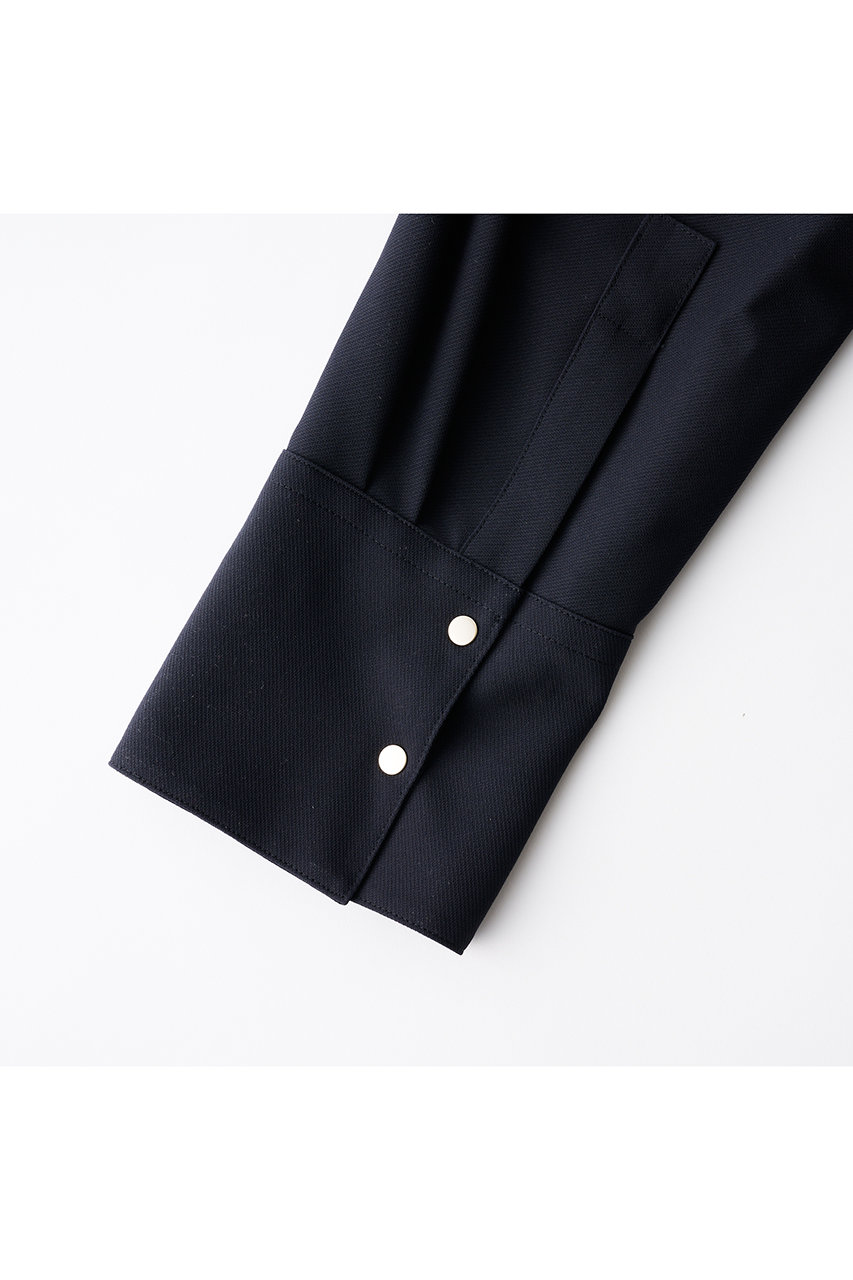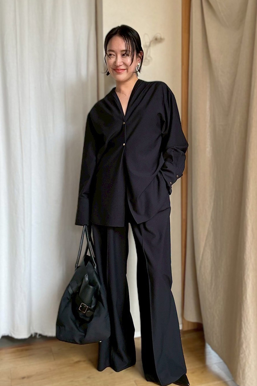 セットアップとしての着用におすすめなのが、同素材のリラックスシルエットのワイドパンツ。前身頃に施した繊細なタックと美しいドレープが、ゆったりとしたシルエットに上品な表情が魅力。