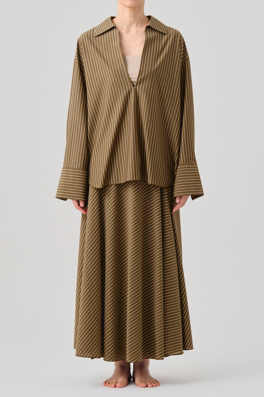 セットアップには同素材のラップスカートを合わせて。ウエストから裾へと広がるフレアラインに、横と斜めに切り替えたストライプがポイント。