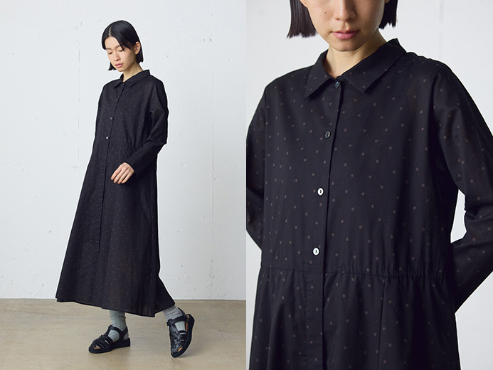 繊細なドット柄をあしらった、軽やかな60ローン素材を使用したシャツワンピース。