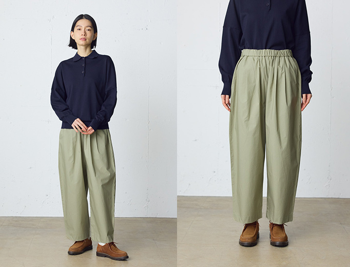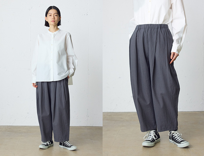 シルエットは、腰まわりにゆとりを持たせたワイドシルエットに、裾にかけてやや細くなるテーパード型。