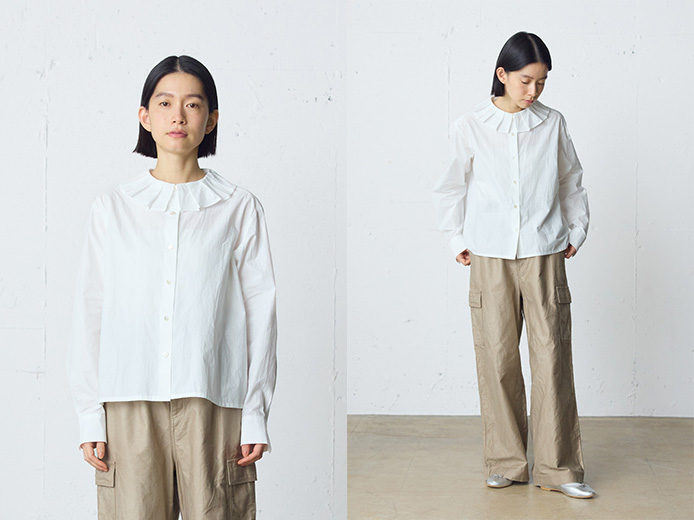 寒い季節にはニットやカーディガン、ジャケットの下に重ねて、タックの入った襟元がさりげなく映えるレイヤードスタイルもおすすめ。
