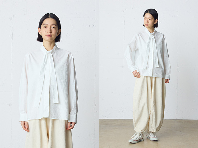 少し太めに仕立てたボウタイが印象的なタイネックシャツ。