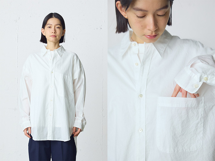 メンズシャツのようなゆったりとしたシルエットを、女性らしく着こなせる一枚に落とし込みました。