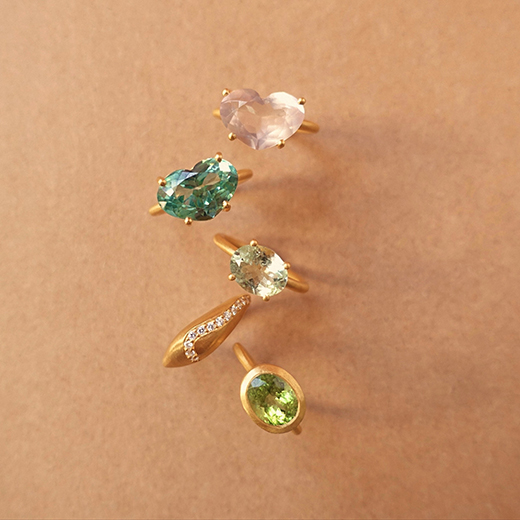昨今、カラーストーンジュエリーでは誕生石を選ぶだけでなく、また透明度や色鮮やかさによる“良い石”だけでなく、不揃いのカットだったり、インクルージョンの個性で選んだり、石の楽しみ方も多様化しています。「クイ」では、海外のマーケットから直接石を買い付けるので、大粒で色鮮やかな石、同じ石でもカットや色味が違うもの、インクルージョンの違い、表情豊かで希少性のある一点ものの素材を、多種にわたってご紹介しています。