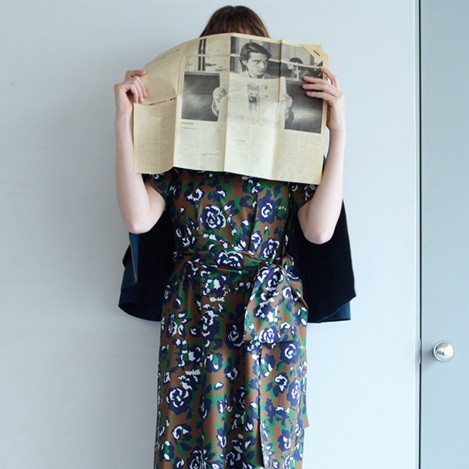 ベーシックなワンウェイ・プリーツスカートは細かなアイレットのスポーティーな素材とレトロなオールドローズプリントの意外性のある組合せが新鮮。ハイゲージニットを合わせてグッドガールなスタイルも素敵。