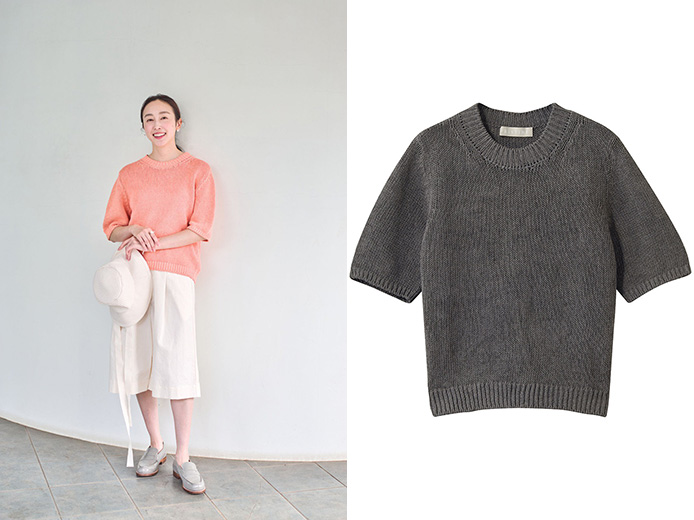丸い袖のフォルムがチャーミングな半袖ニットは、ゆとりがありながらコンパクトに収まるバランスで着膨れせず、二の腕が隠せるところも嬉しいポイント。和紙とコットンの高撚糸を使用したシャリ感のある素材で、汗を吸ってすぐ乾く、快適な着心地が魅力です。