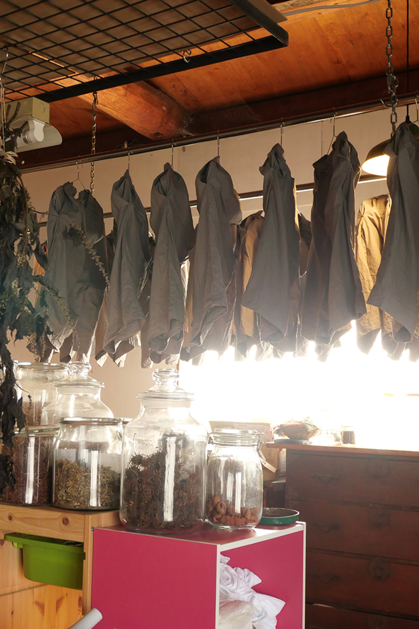 味わい深い草木染の色は、大阪府和泉市にある「WUY」さんにて。自然の摂理にそって環境に優しい安全な素材を使用したオリジナルのプロダクト生産や草木染めによる衣類の染め直し〝Re:染め〟を行っている工房です。漢方薬として、樹皮は痛み止め、根は虫下し、果実は疲労回復薬に使われてきたザクロの果皮を染料に、鉄媒染で1点1点丁寧に染め上げました。ベーシックなコーデも、素材の風合いでしっかりスタイリングに表情をつけてくれます。