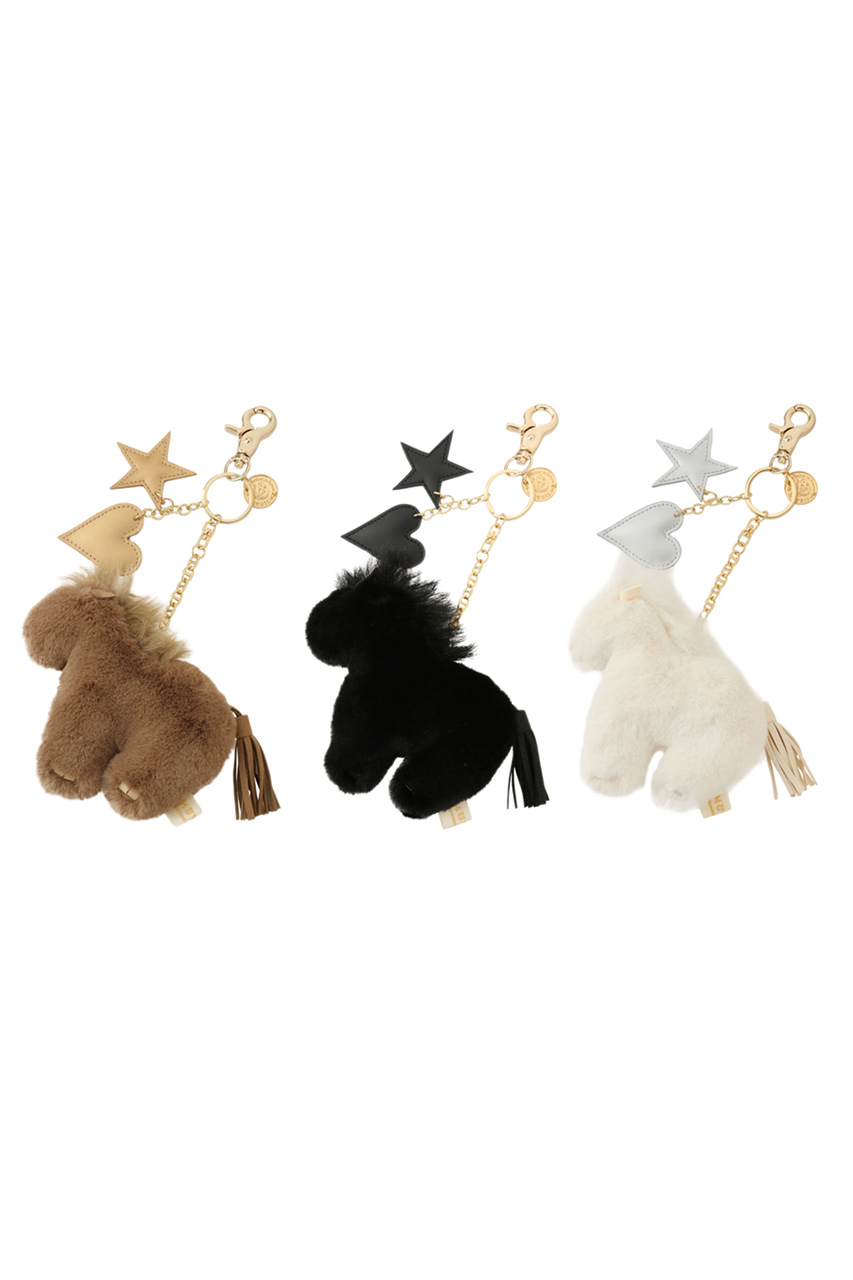 2026年の干支をデザインしたフェイクファーの馬のマスコットが愛らしいキーチャーム。しっぽはタッセルにし、あえて目は付けずに大人っぽく仕上げました。星とハートモチーフのチャームもポイント。