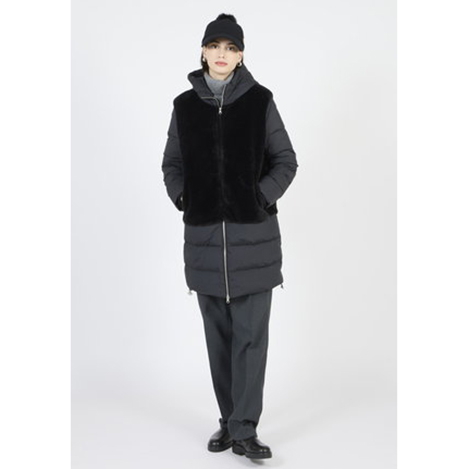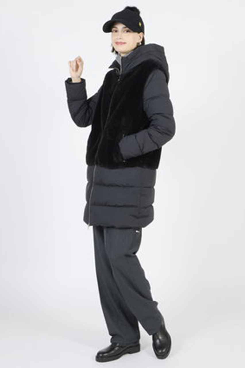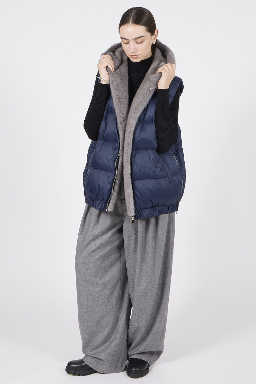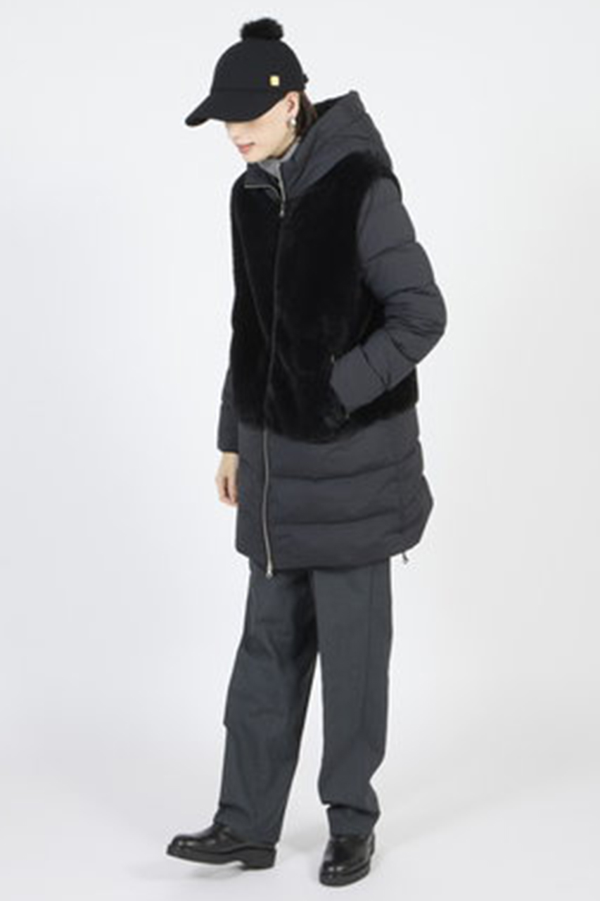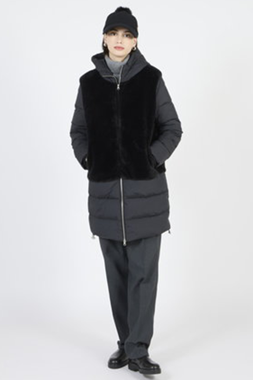 アレンジ自在の秋冬ジレ。ミンク風のとろけるフェイクファーがリュクス感を添え、Iラインで大人っぽく洗練。ファーは着脱可能で、シンプルなダウンとしても楽しめる万能アイテム。