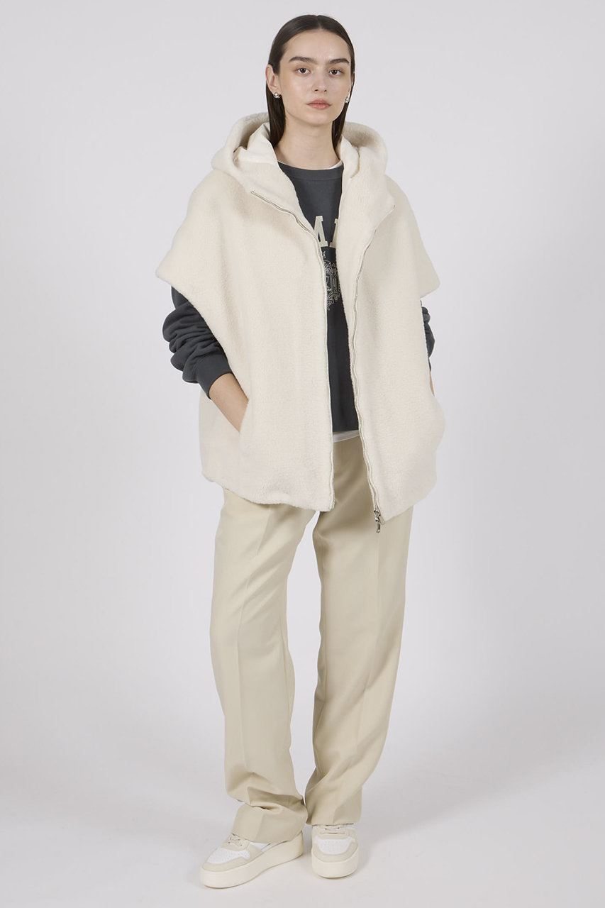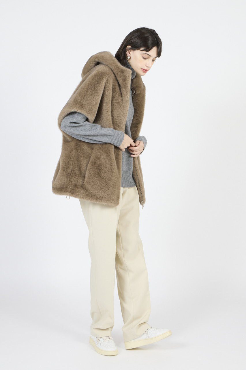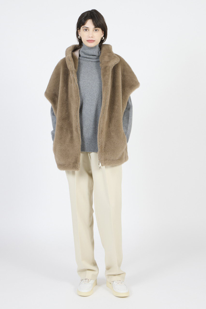 カジュアルなフード型にミンク風素材を合わせ、ラフさと上品さを両立した大人のジレ。ヒップが隠れるミドル丈は安心感があり、細身のボトムとも好相性です。フレンチスリーブで暖かく、厚手ニットに重ねるだけでいつものコーディネートをクラスアップ。体型カバーと高級感を同時に叶える、スタイル格上げの主役アイテムです。