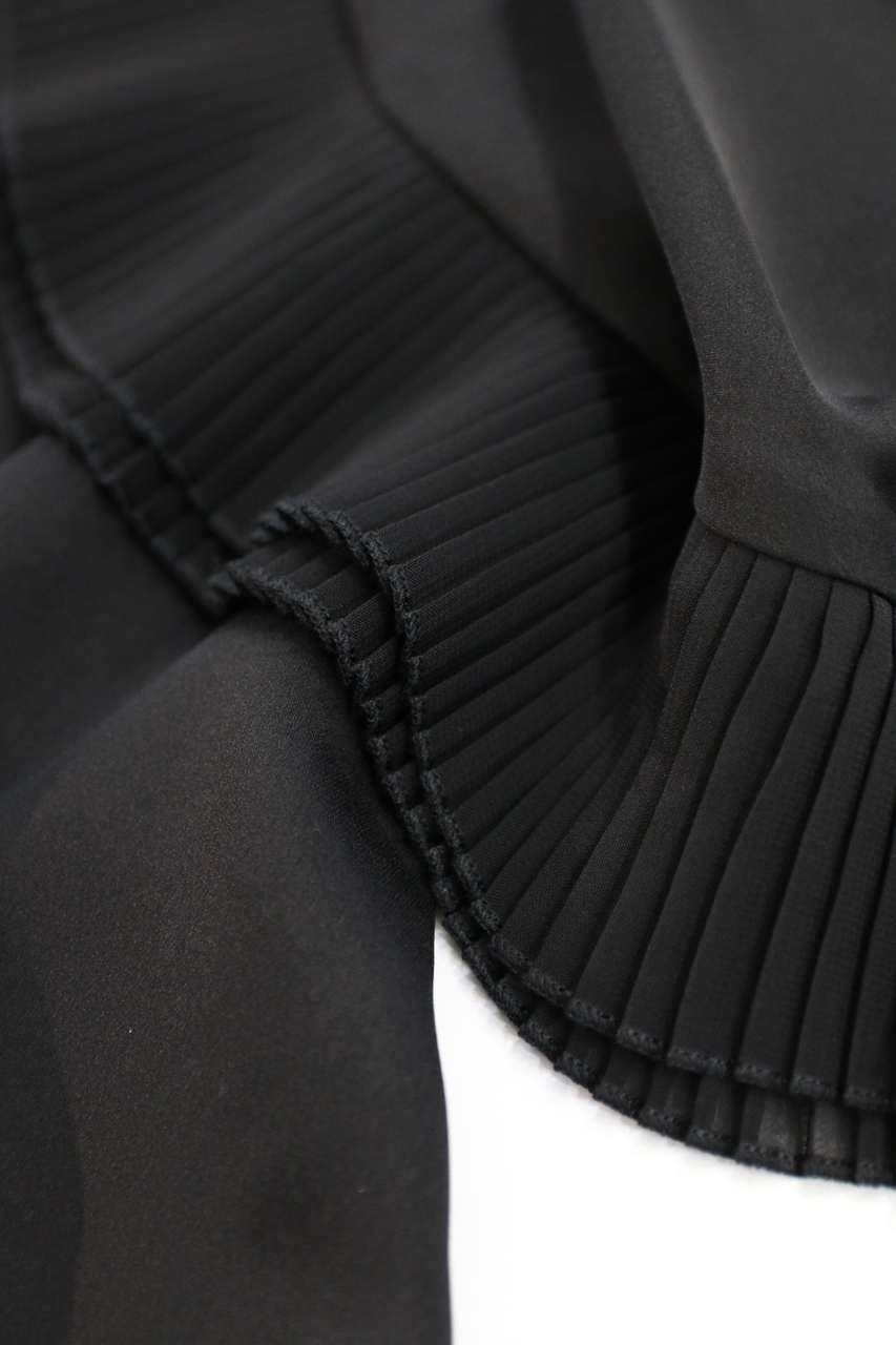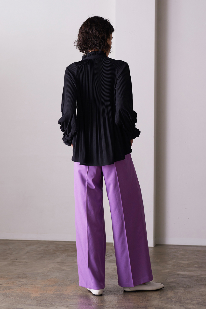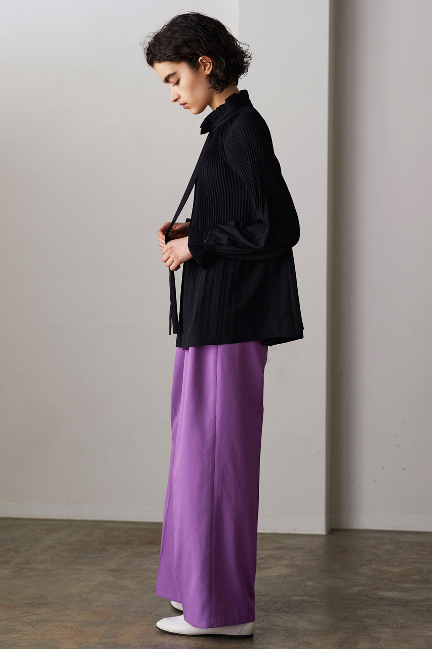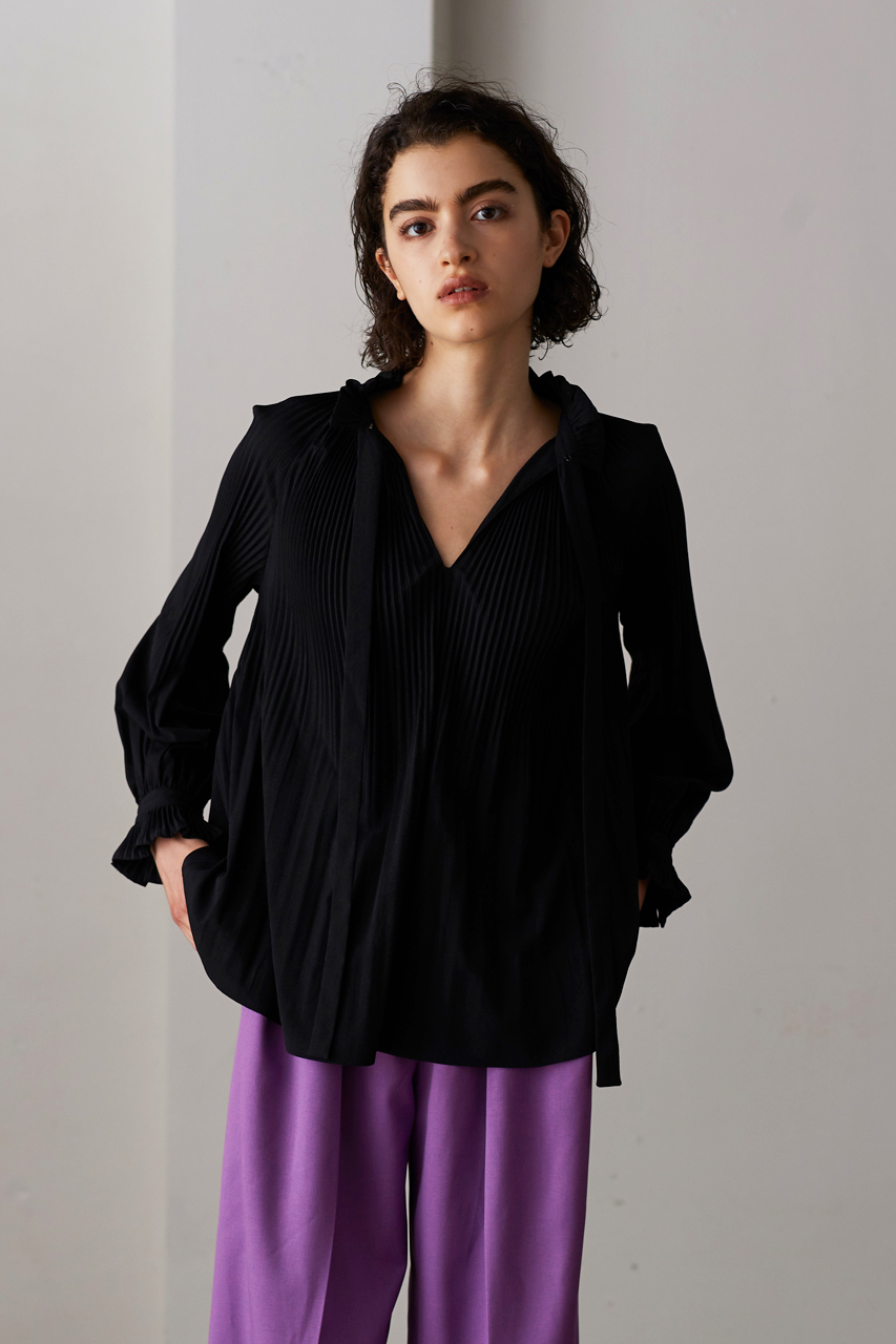落ち感のあるポリエステル生地に繊細なアコーディオンプリーツを施した、ボウタイブラウス。ラグラン袖とネックを中心に放射状に広がったプリーツは、肩周りを華奢に見せてくれます。ボウタイを結んでクラシックに着こなしたり、タイをほどいてネックをVあきにして抜け感のあるスタイリングもおすすめです。アウターからのぞく襟元と袖口のプリーツフリルがスタイリングのアクセントに。イージーケア素材もうれしいポイントです。