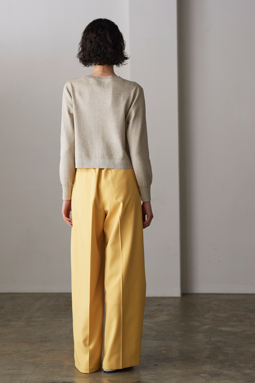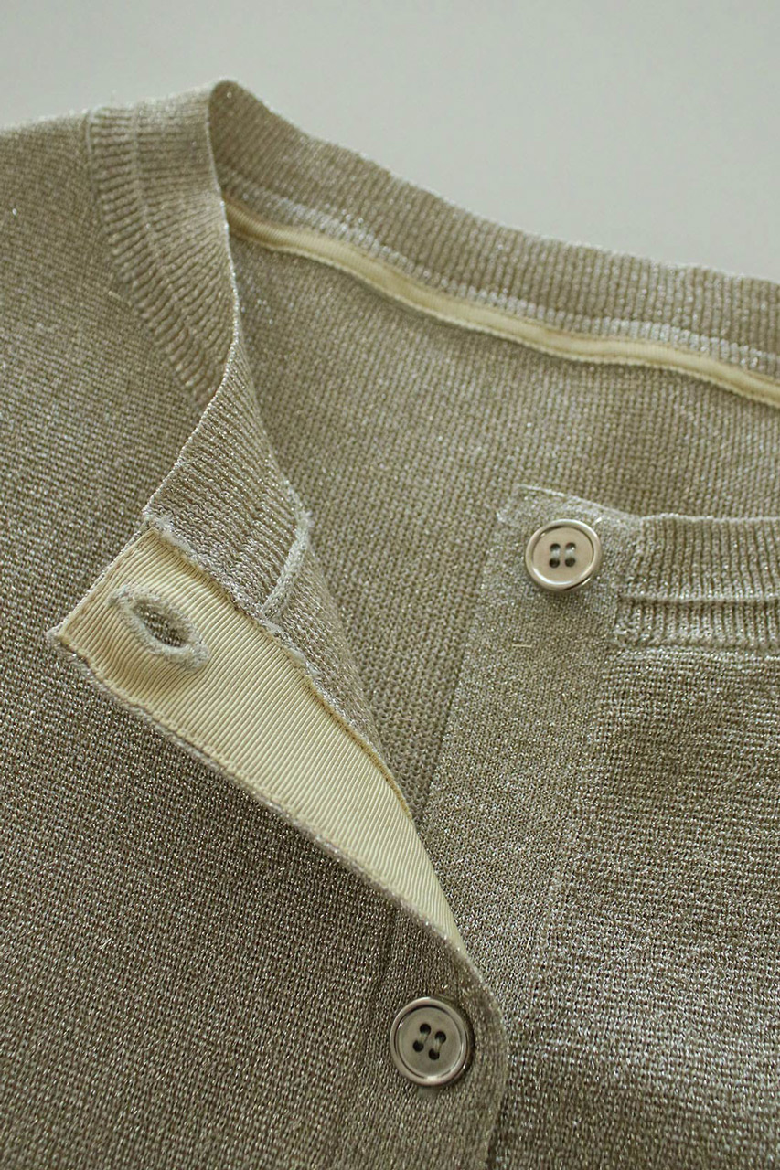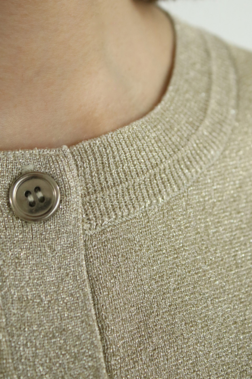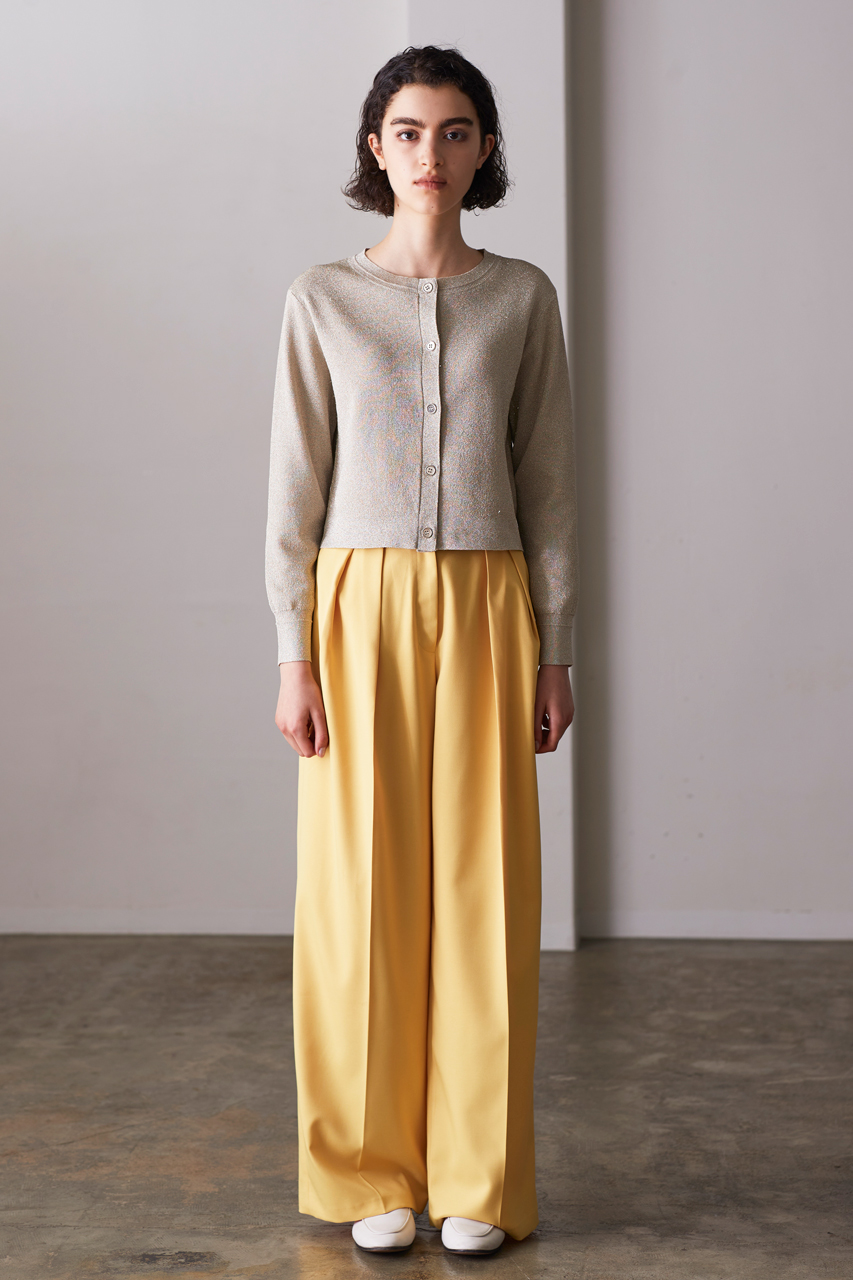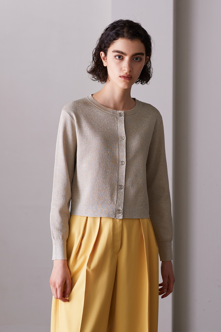 ラメ糸をゴム地に編んだゆとりのあるワイドな身幅に、すっきりとした袖が上品なカーディガン。クロップド丈なので、ボタンを閉めてトップスとしても着こなせます。コートの中にも着やすく、これからの季節にぴったり。上品なラメの煌めきが気分も明るく華やかにしてくれます。
