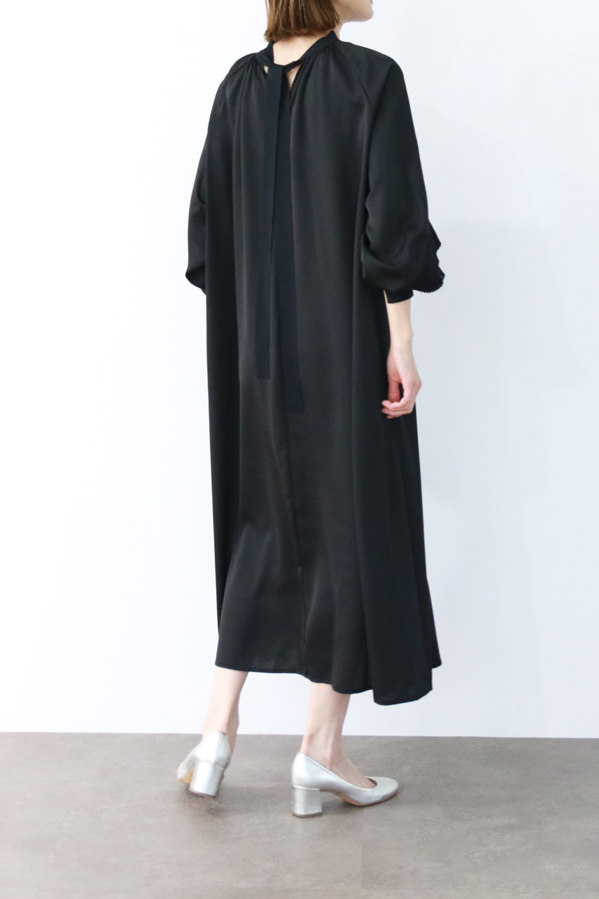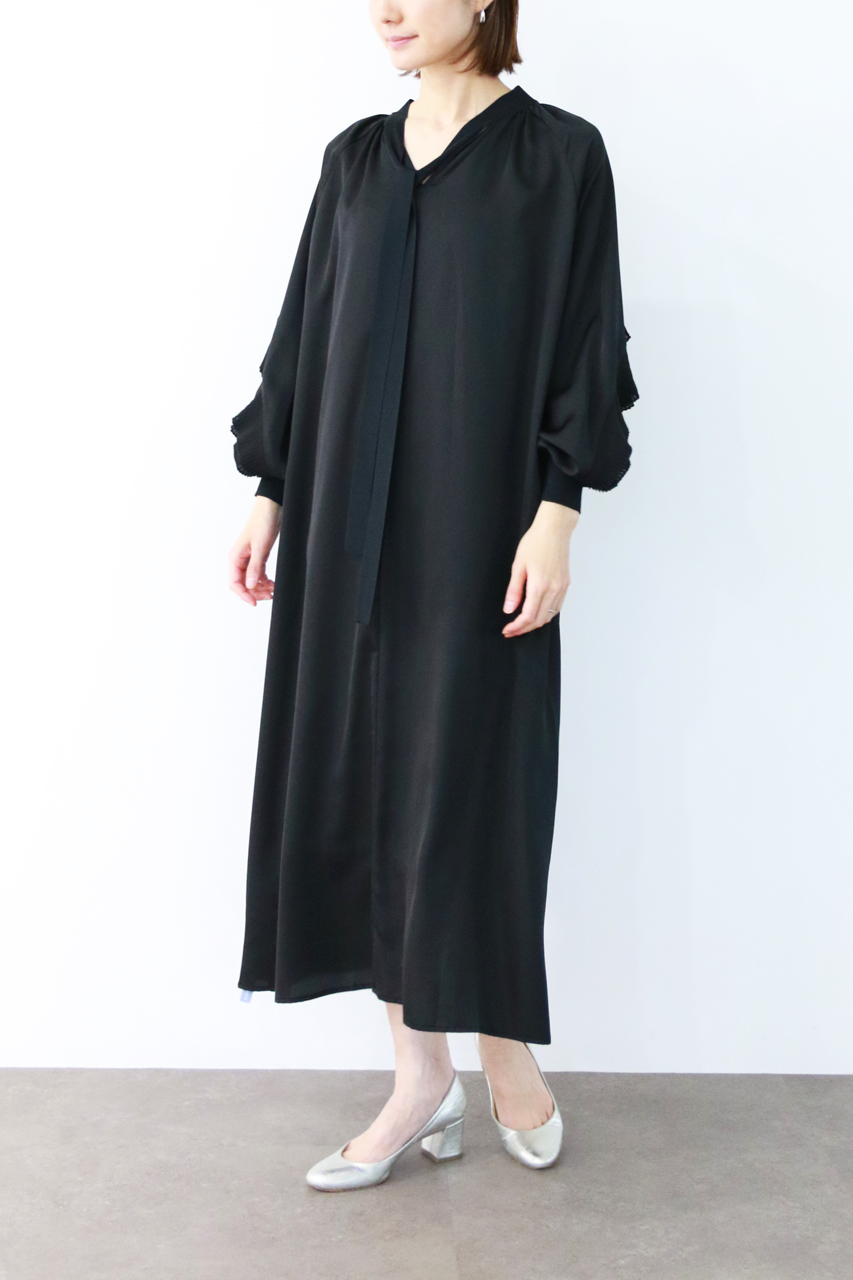 ドレープの美しい華やぎエレガンスモードなワンピース。なめらかでとろみのある肌触りと、上品な光沢感が魅力のサテン素材。肩から袖口にかけて施した螺旋状のフリルは、前後2wayで表情豊かな着こなしを楽しめます。襟のニットタイはリボン結びや片結び、ゆるく結んで流すように垂らしても◎。