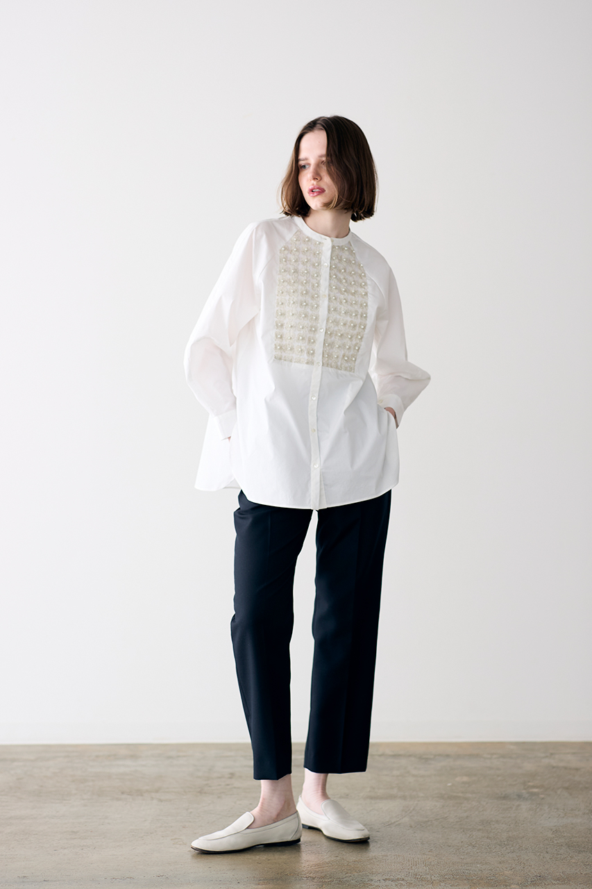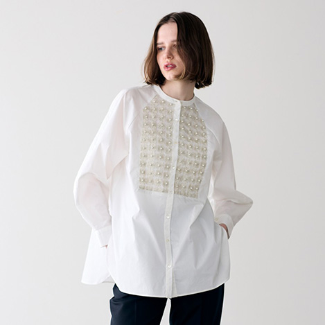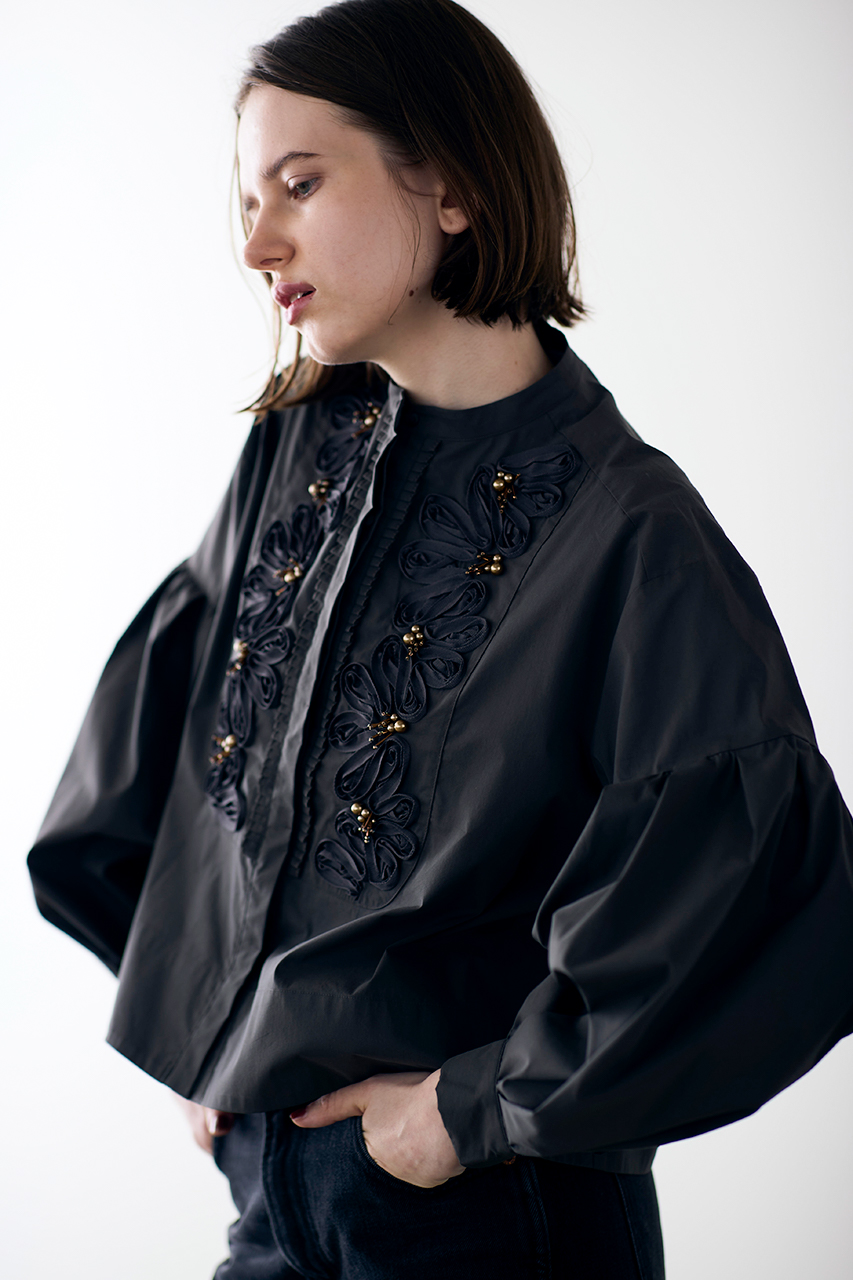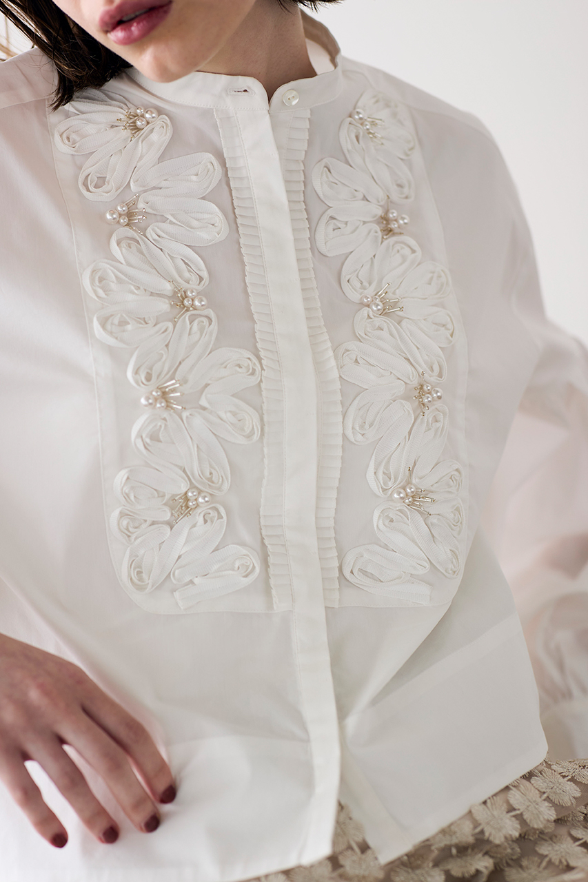 ハンド加工によるコード刺しゅうに、繊細なバランスであしらわれたパールとフリンジビーズが、ロマンティックなムードを引き立てるデザインブラウス。光沢とハリのあるポリエステルコットン素材が、美しい立体シルエットを演出します。程よいクロップド丈はスタイルアップ効果も。カジュアルなアイテムとも好相性で、日常の装いにも自然に馴染む一枚。オン・オフ問わず、さまざまなシーンで活躍します。