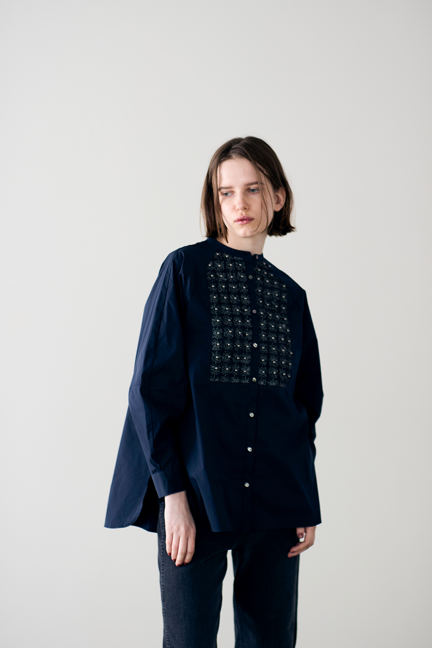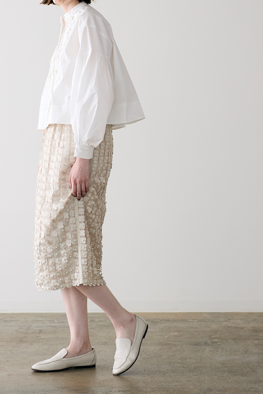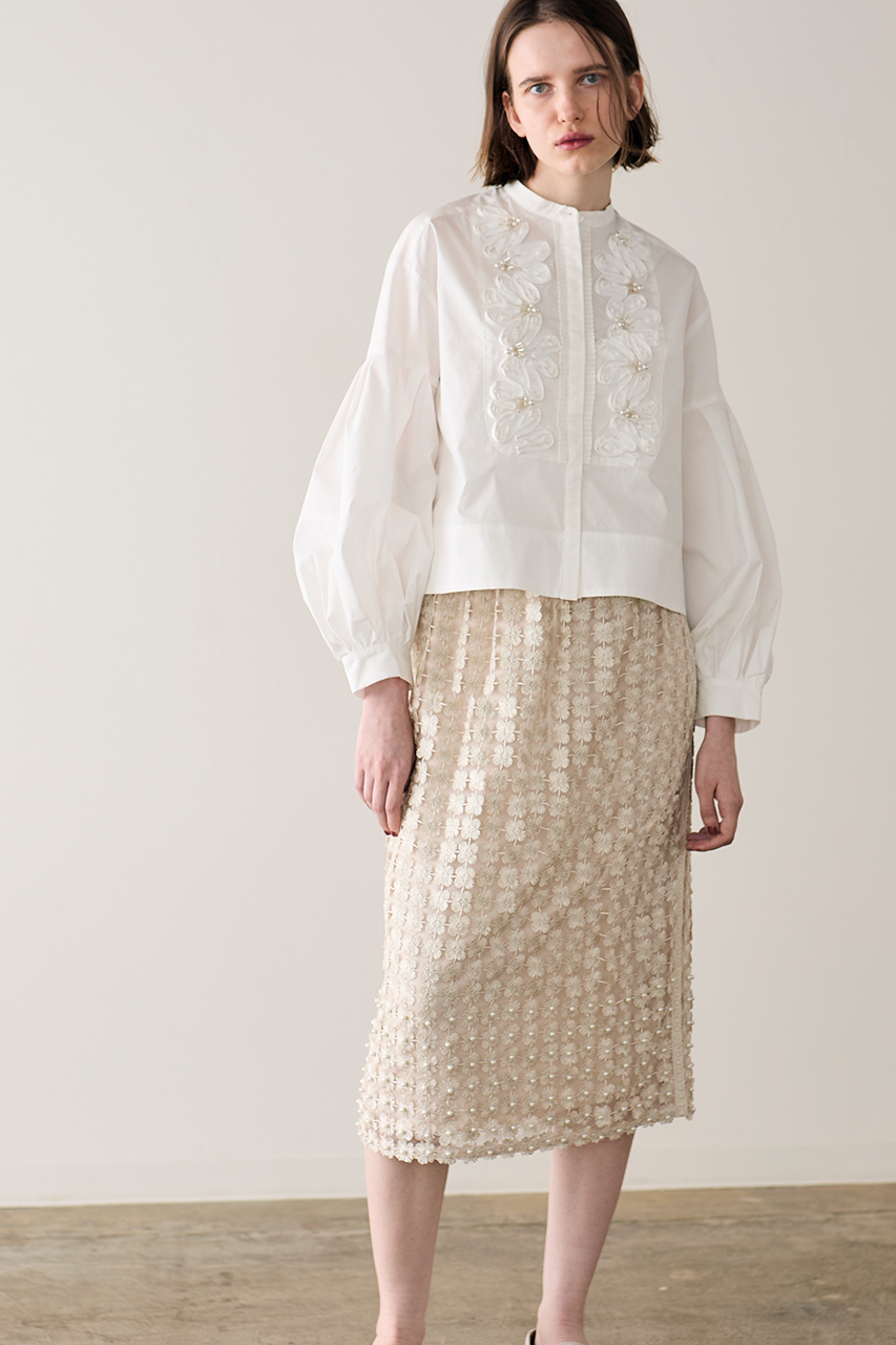 ハンド加工によるコード刺しゅうに、繊細なバランスであしらわれたパールとフリンジビーズが、ロマンティックなムードを引き立てるデザインブラウス。光沢とハリのあるポリエステルコットン素材が、美しい立体シルエットを演出します。程よいクロップド丈はスタイルアップ効果も。カジュアルなアイテムとも好相性で、日常の装いにも自然に馴染む一枚。オン・オフ問わず、さまざまなシーンで活躍します。