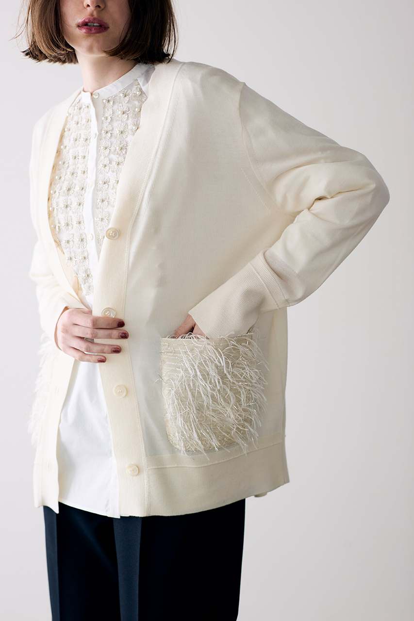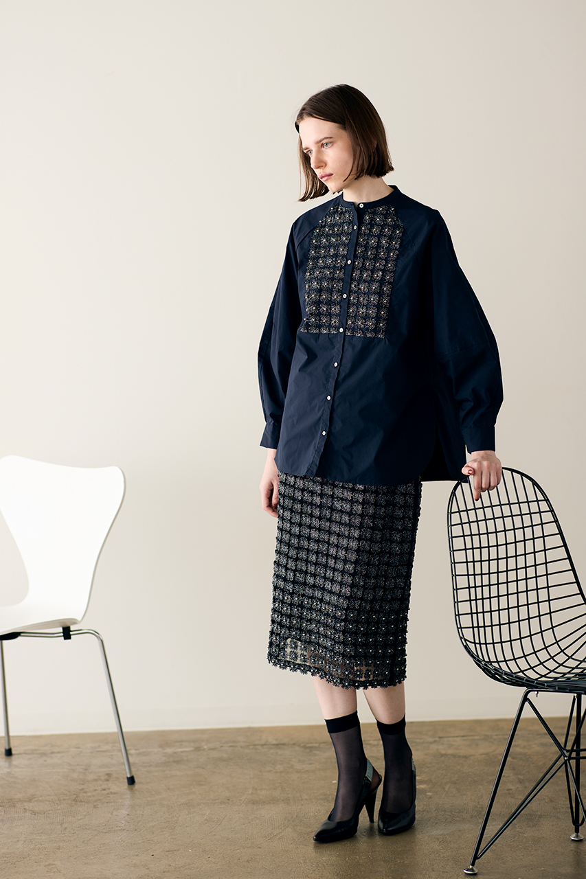 別注のパール、ラメ、レースを贅沢にあしらった、クチュールライクな一枚。立体感のあるコクーンスリーブと、すっきりとしたノーカラーデザインが、華やかさの中にクラシックな品を添えます。一枚で着映えするのはもちろん、秋が深まる季節には羽織を重ねて、さりげなくパールを覗かせたレイヤードスタイルもおすすめ。同シリーズのスカートとセットアップで着こなせば、より特別感のあるコーディネートに。