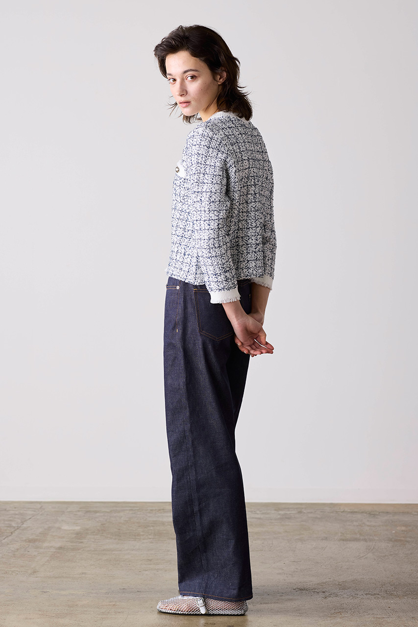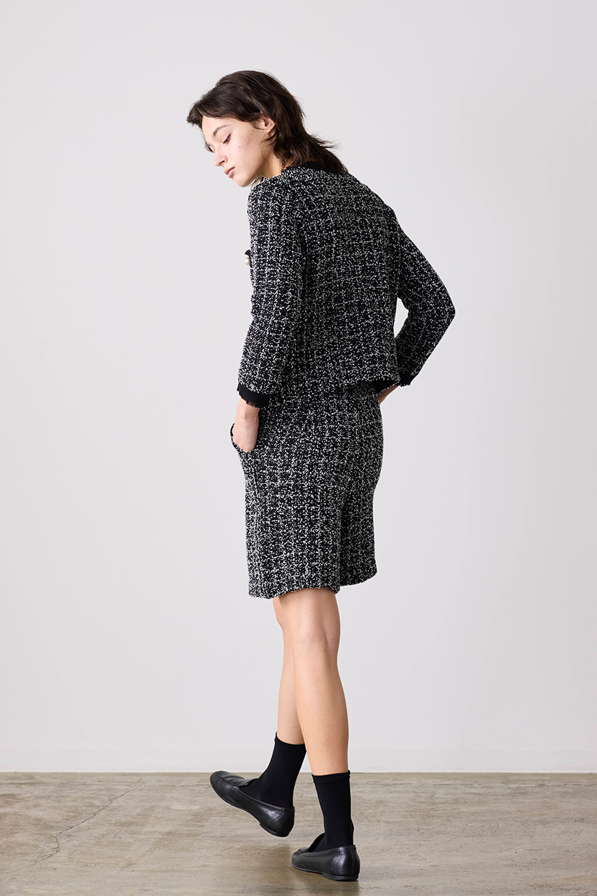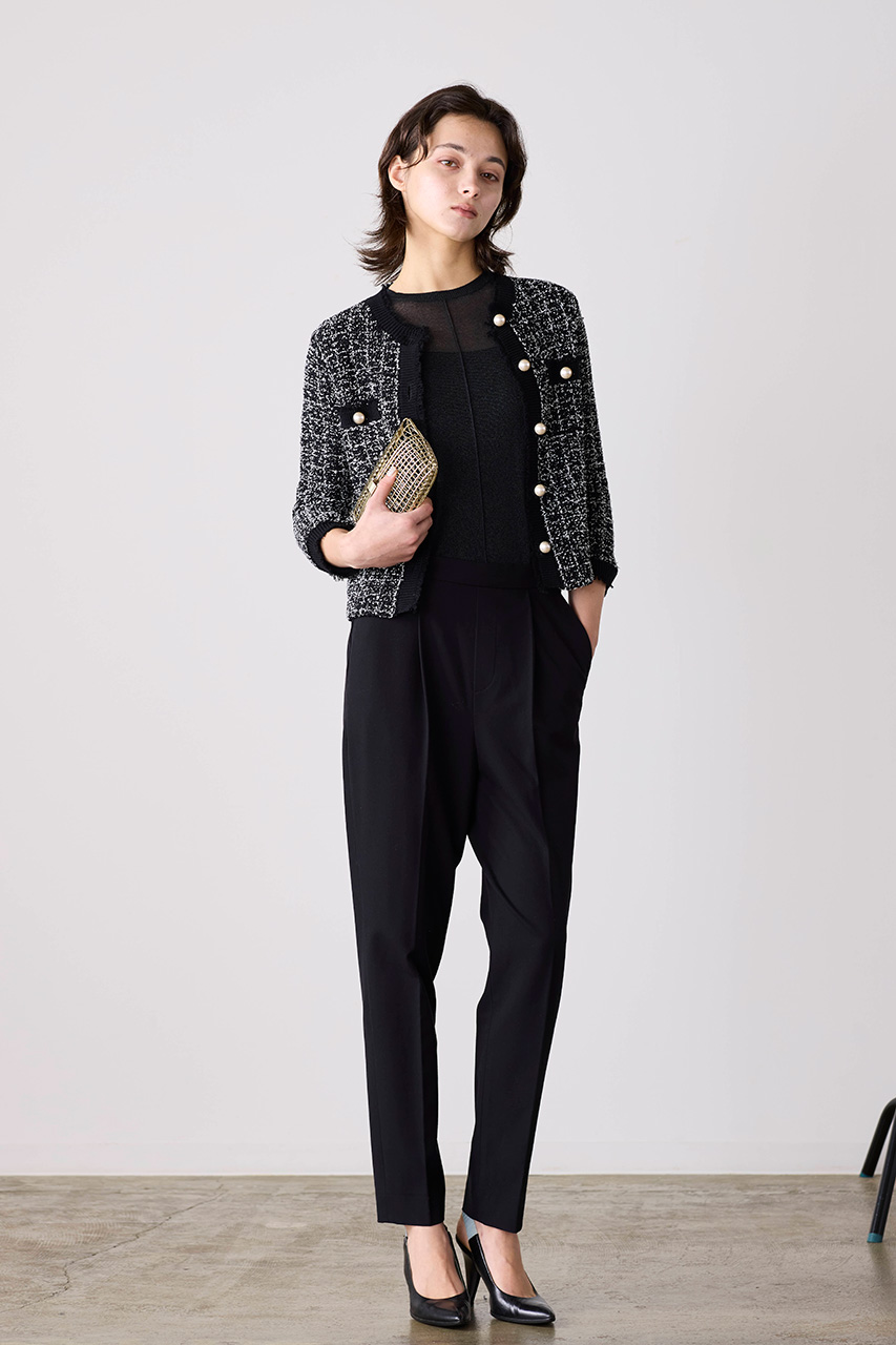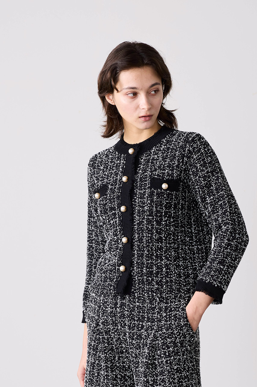 表情豊かな編地が魅力のツイード風ニットジャケット。フリンジディテールとELLE SHOP限定のパールボタンが、ベーシックなシルエットに上品なアクセントをプラス。シンプルなパンツでクリーンに、同シリーズのパンツと合わせればきちんと感のあるスタイルに。改まったシーンにも取り入れやすい一着です。