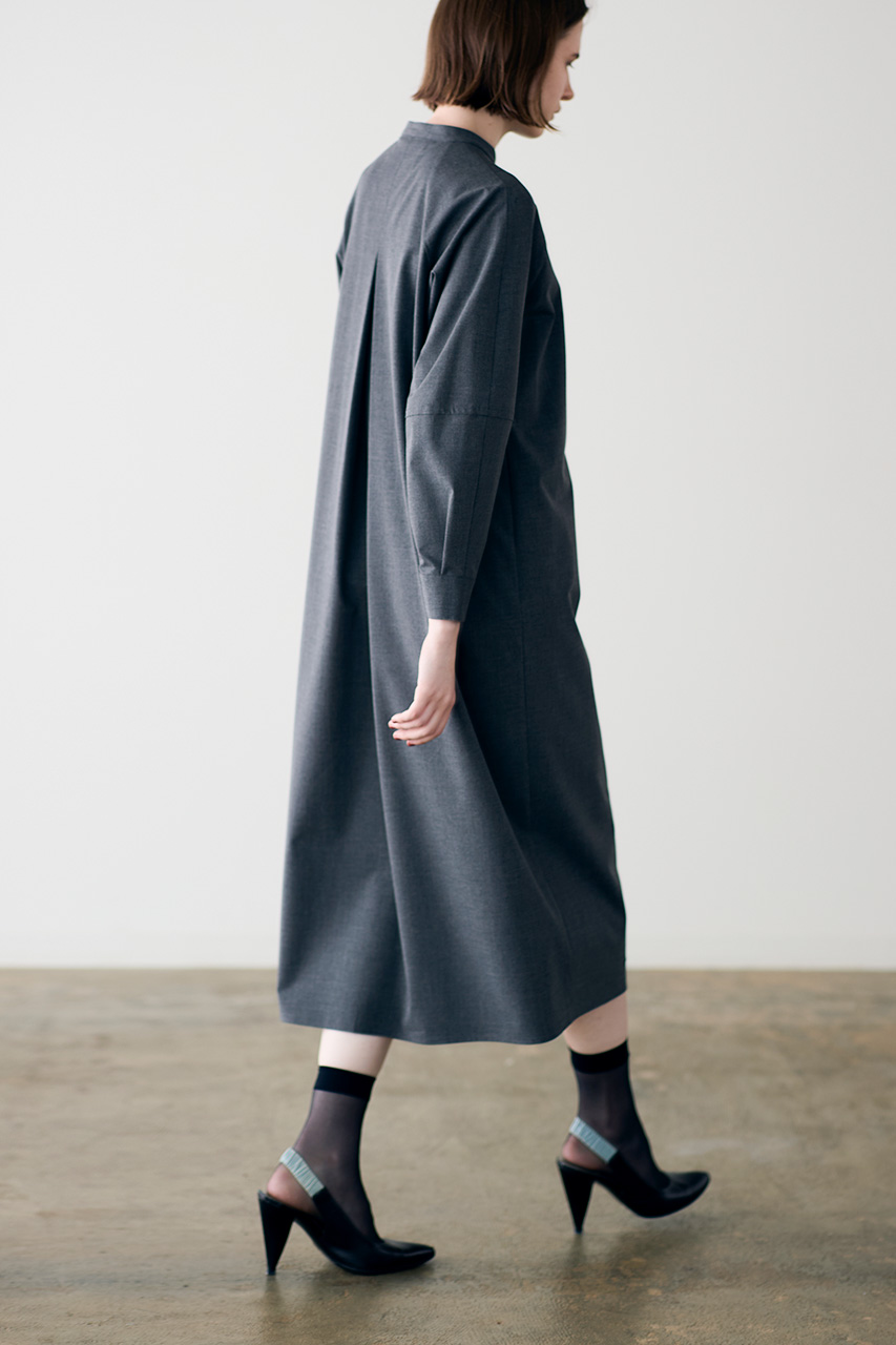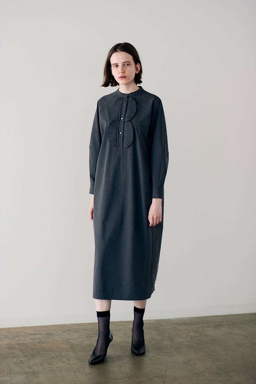 クリアでなめらかなハリのあるストレッチ素材にプリーツ加工を施した、2段ジャボワンピース。ラグランのコクーンスリーブと後ろタックが立体感とモダンさを演出し、バランスよく配したプリーツが印象的。ピリングしにくい素材で、セレモニーからきれいめなデイリーまで品よく活躍します。