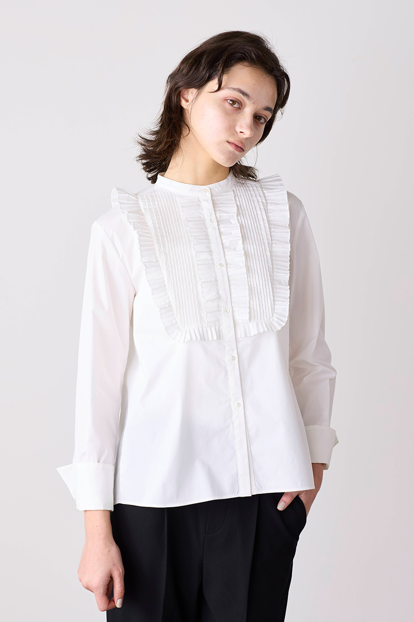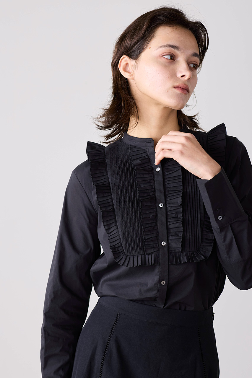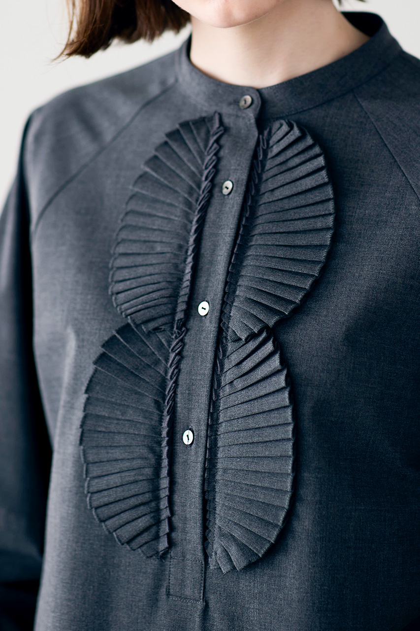 構築的なプリーツとタック、シャープなシャツスリーブが洗練された印象のデザインブラウス。ハリと光沢のあるコットンポリエステル素材のプリーツフリルが存在感を演出し、特別な日にも普段使いにも頼れる一枚です。