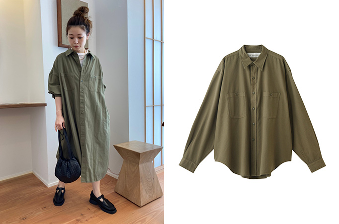 ベルトでウエストをマークしたり、そのままストンと着たり、着こなしに変化をつけられるシャツワンピース。インナーにTシャツを合わせてカジュアル感をプラスしたコーディネートもおすすめ。ブラックの小物を合わせることでモード感がプラスされ、クラスアップしたスタイルに。同シリーズのシャツタイプもおすすめです!