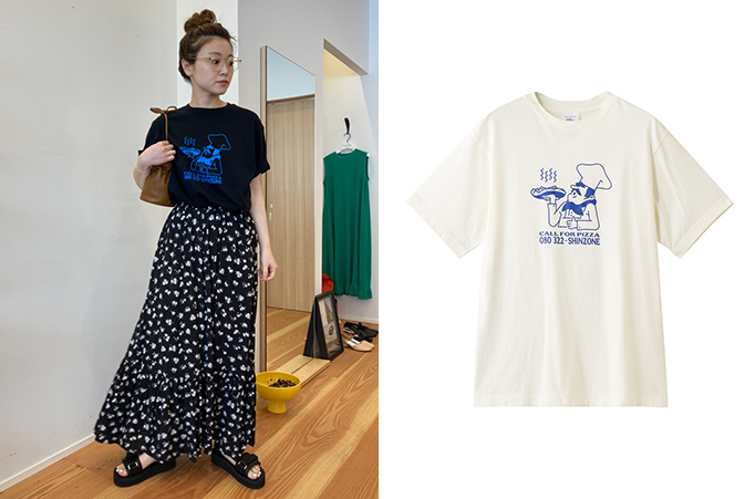 PIZZA SHOPのオリジナルグッズをイメージして作り上げたシリーズ。ポップでキュートなモチーフが、コーディネートのアクセントに。程よくゆるめのサイズ感に、肌触りのよいコットン生地でこれからの季節にぴったりのTシャツです。スカートは、ブラックベースに白いデイジー柄を施したティアードシルエット。さらりとしたエアリーな風合いでふんわり広がるデザイン。シーズンレスで着まわせるアイテムです。
