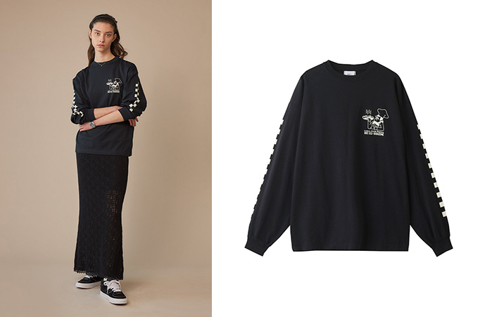 上記シリーズのロングTシャツタイプ。ユニークなキャラクターモチーフと袖のチェッカーフラッグ柄がキュートなトップス。ややマーメイドラインで仕上げたスカートは、レース生地ではなく、ニットで編み立てたレースニットのデザイン。ミドルゲージであまり透け感がなく、ヘルシーな雰囲気で着こなせるアイテムです。