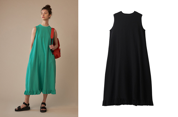 カジュアル見えしてしまうカットソーワンピースを、布帛の梨地のような凹凸のある生地で仕上げたアイテム。トレンドのグリーンをオリジナルで染めた絶妙な色合い。秋冬はカーディガンやジャケットを羽織ったスタイルもおすすめです。
