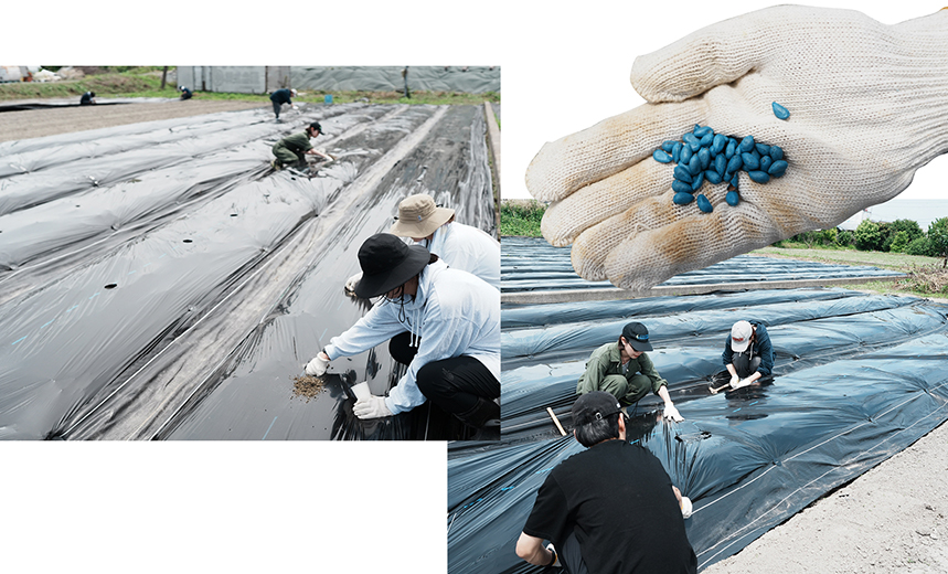 農作業でも装いに妥協しない、そんな私たち。シートを敷いて固定し終えたら、種まきのための穴を等間隔に開け、いよいよ種まきへ。土をやさしくほぐしながら、2粒ずつ種を蒔き、そっと土を被せていきます。その作業を、30m×6本分。さて、綿花の種と聞いて、どんな姿を想像しますか? 実はこの小さな種、ふわふわのコットンボールの奥にひっそりと隠れているのです。小さな小さな種たちが、たくさんのコットンボールを実らせてくれますように。そんな願いを込めて、この日の作業は終了しました。