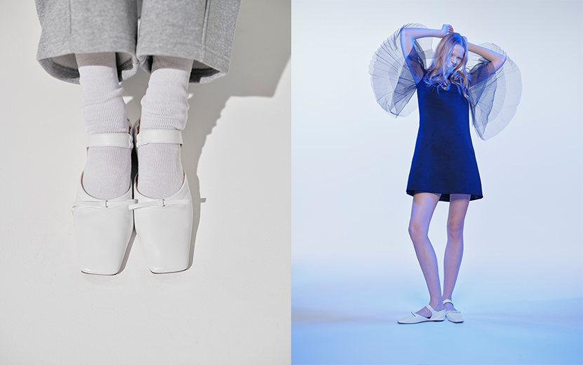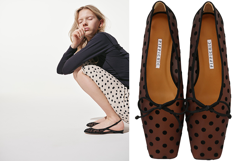 甘くなりがちなドット柄を繊細なチュール素材でセンシュアルに仕上げた2モデル。浅めのラウンドトゥとバックストラップがヌーディで女性らしい印象を与えるフラットシューズに加え、人気の“AMBER BALLET”もELLE SHOP限定カラーで登場。
