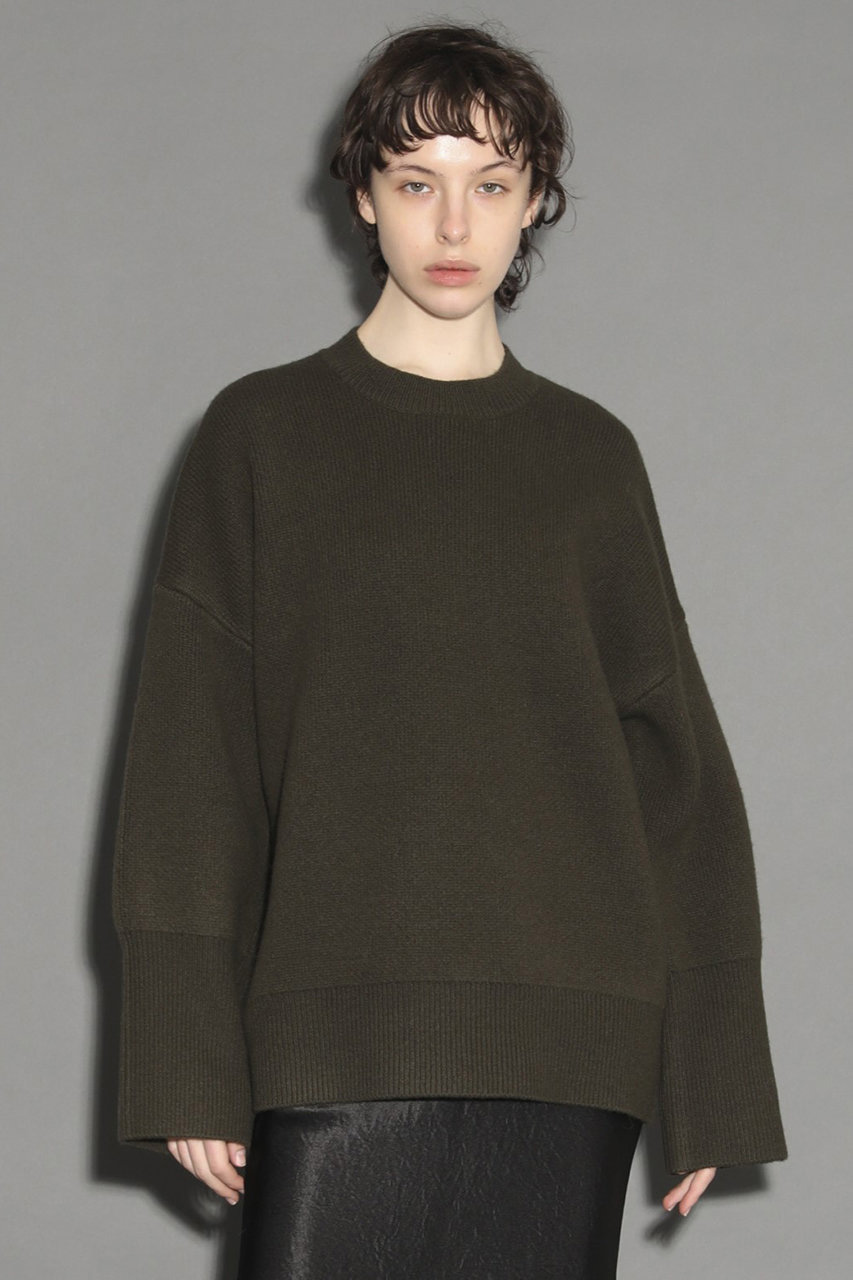 ラムウール素材を使った、ふっくらとハリ感のある風合いのトップス。オーバーシルットとワイドスリーブで、こなれ見えするのも高ポイント。