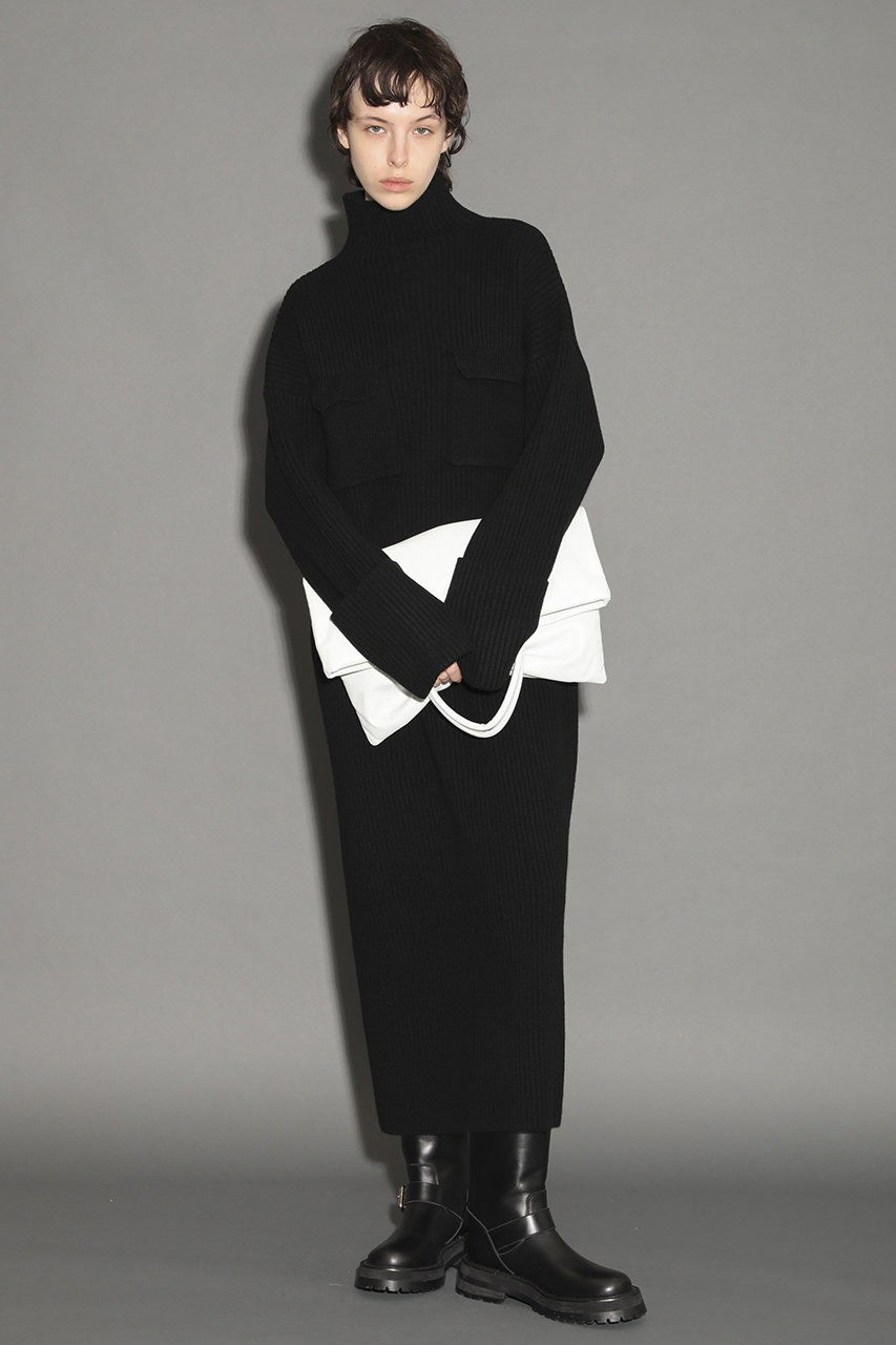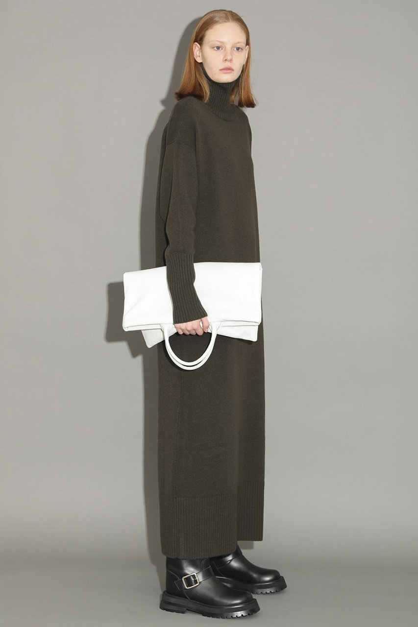 特徴的なフォルムのデザインスリーブとマキシ丈がポイントのニットワンピース。ミニマルなデザインながらエッジを効かせた1着です。今シーズントレンドのジレとのレイヤードスタイルにもぴったり。