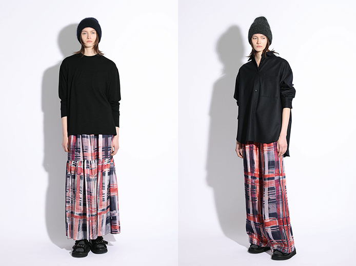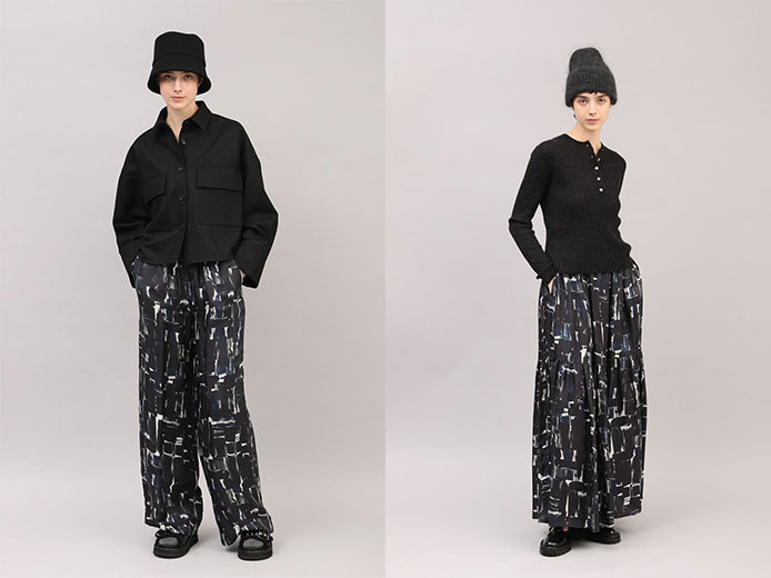 今季はブラッシュペイントやフラワープリントの3種のプリントをご用意。光沢感とドレープ性を備えたキュプラレーヨン素材にのせて、大人なプリントに仕上がっています。シーズンレスで使えて重宝するシリーズです。