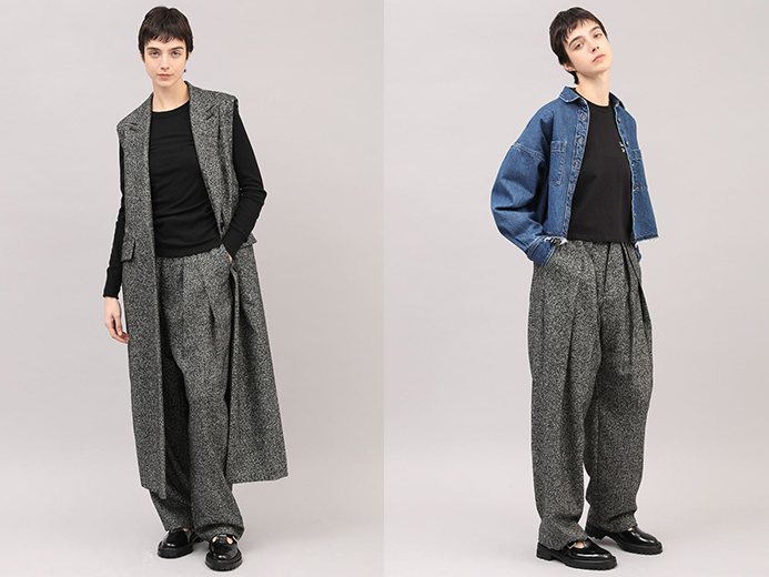 イタリアの老舗BALLI社の上質なヘリンボーンツィードを使用した、「サクラ」別注素材のテーパードパンツ。深みのある表情と上品な光沢をともなったヘリンボーン柄が魅力的。深くたたんだフロントタックからなるワイドシルエットと、裾にかけてテーパードさせたラインがマニッシュな雰囲気を演出し、バックスタイルの尾錠付きベルテッドディテールもポイントに。同素材のジレやジャケットと合わせたセットアップスタイルもおすすめ。