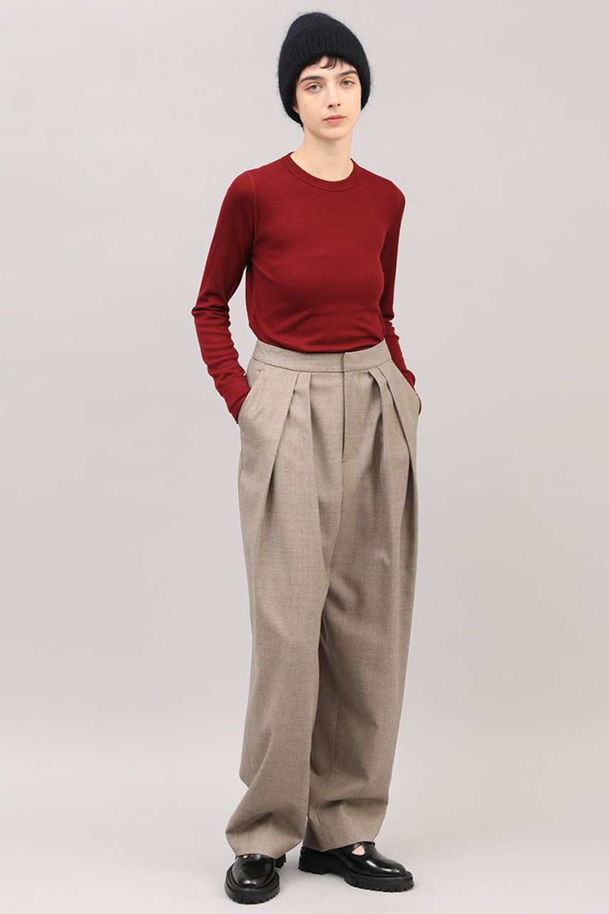 深くたたんだタックからなるワイドシルエットと、裾にかけてテーパードさせたラインがマニッシュな雰囲気を醸し出すテーパードパンツ。上品な光沢と程よいハリが特徴のウールサージを使用した、上質な先染ウールならではのきめ細やかなメランジ感のある表情が魅力。バックスタイルの尾錠付きベルテッドディテールもポイント。