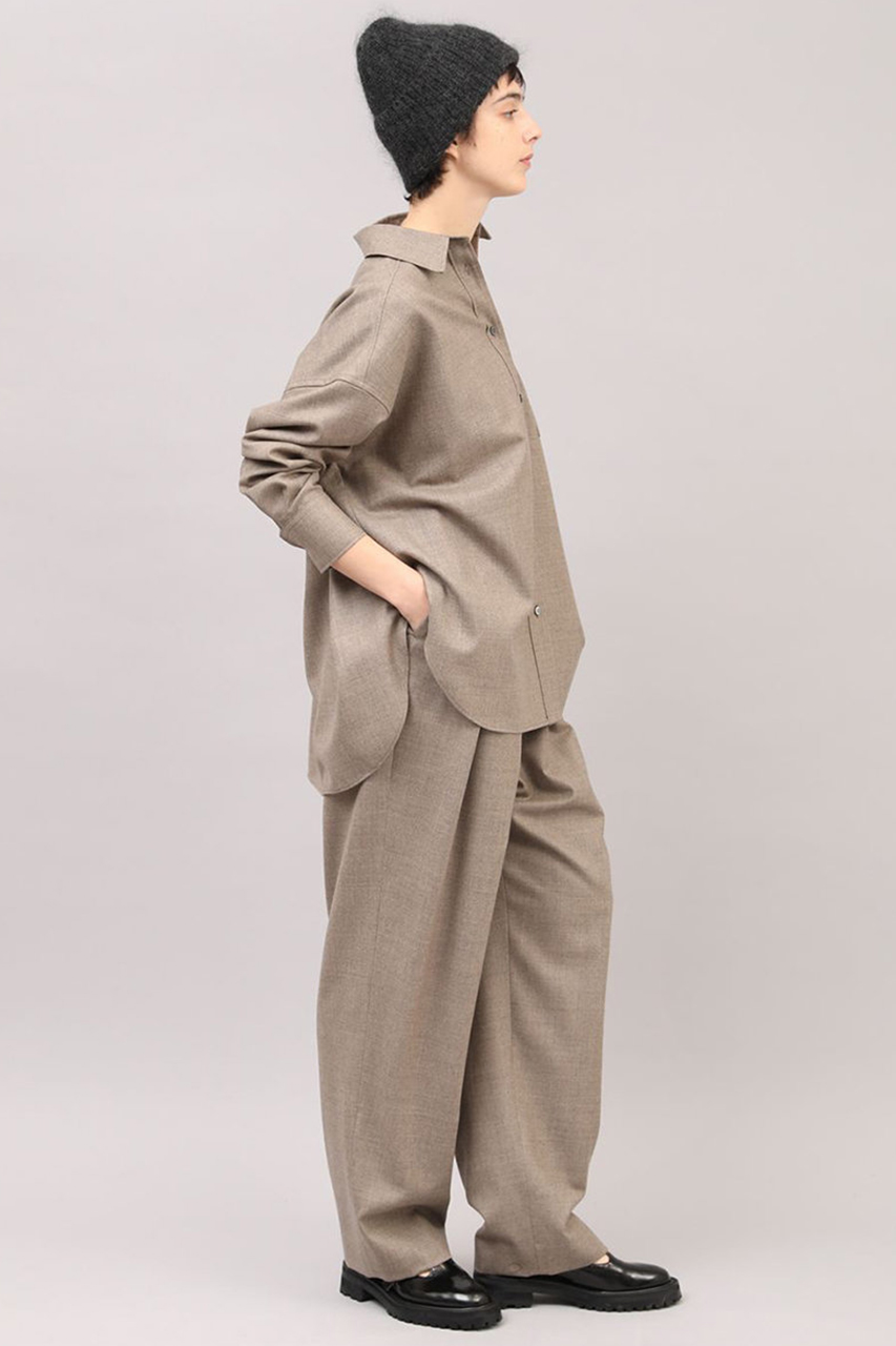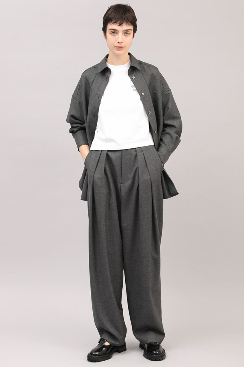 上質な光沢となめらかな風合いが魅力のスーパーファインフラノを使用したウール素材のワイドテーパードパンツ。フロントのトリプルタックが生み出す立体的なシルエットが、モードで上品な印象を演出。ウエストはマーベルト仕様で後ろのみゴムを内蔵し、サイドボタンでサイズ調整も可能。快適なはき心地と美しいフォルムを兼ね備えた一本です。ミニマルにグレーのワントーンコーデでまとめて。同素材のシャツとコーディネートも◎。