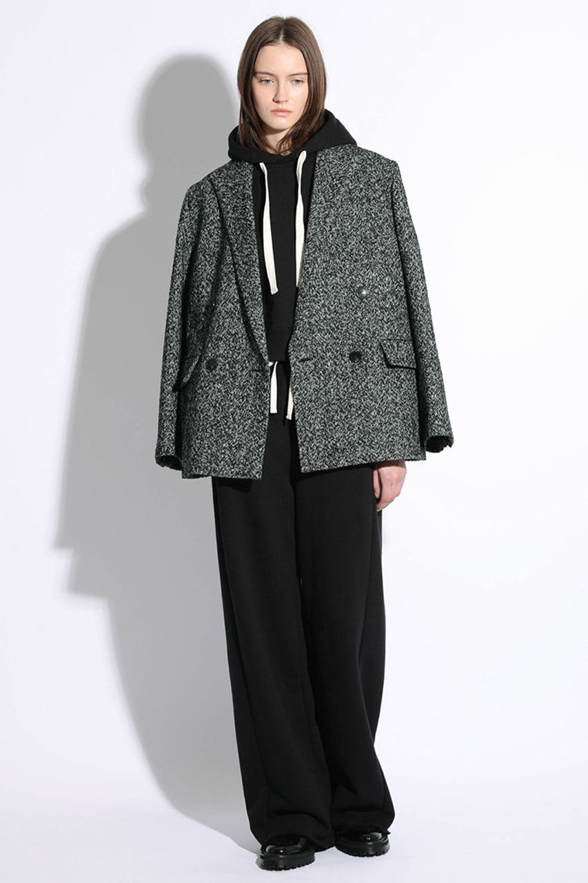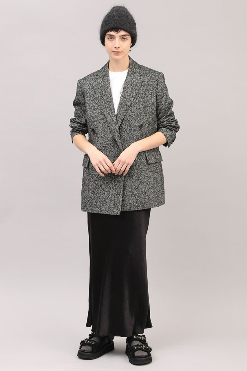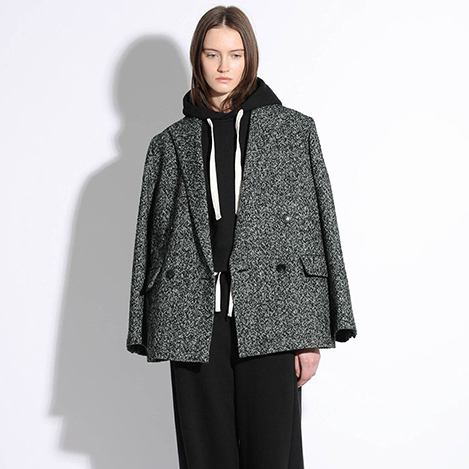 繊細なミニループ糸で織ったビッグヘリンボーンツイードのダブルブレストジャケット。肩パッド入りの程よいビッグショルダーが、マニッシュなオーバーシルエットを演出します。ライトアウター感覚で長い季節活躍する一着です。