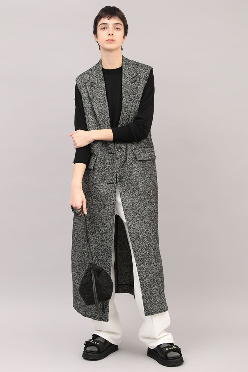 イタリア老舗BALLI社の上質なヘリンボーンツィードを使用した「サクラ」別注素材のテーラードロングジレ。深みのある表情と上品な光沢をともなったヘリンボーン柄が魅力。肩パッド入りショルダーから生まれる程よいオーバーシルエットがマニッシュな印象に。大きめのピークドラペルもポイント。