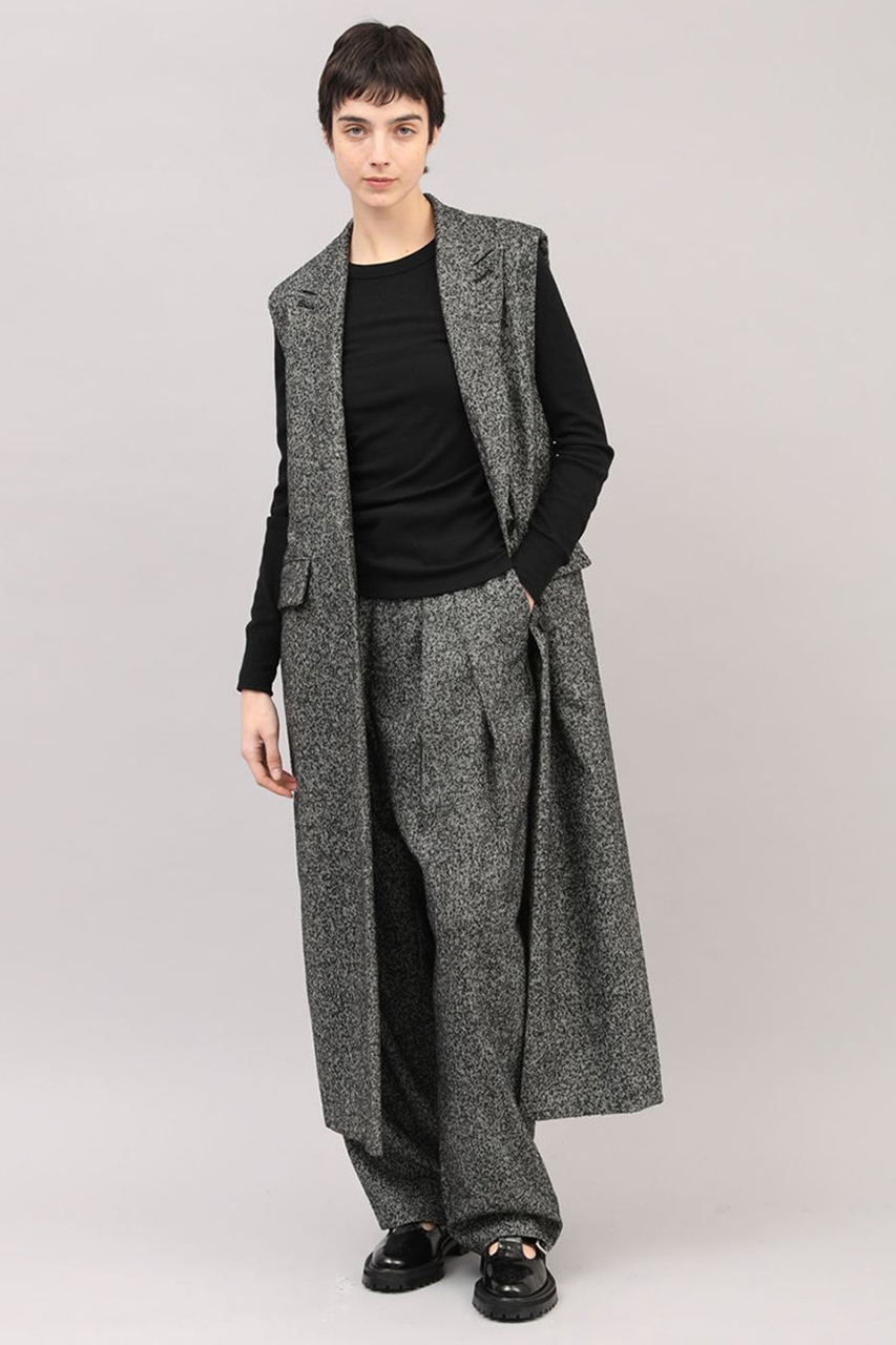 前出のジレと同素材のダブルブレストテーラードジャケット。メンズテーラード仕立ての本格的なつくりで、肩パッド入りの程よいビッグショルダーが生むオーバーシルエットは、マニッシュな雰囲気を演出。羽織るだけで上質な素材感と仕立ての良さが際立つ一着。