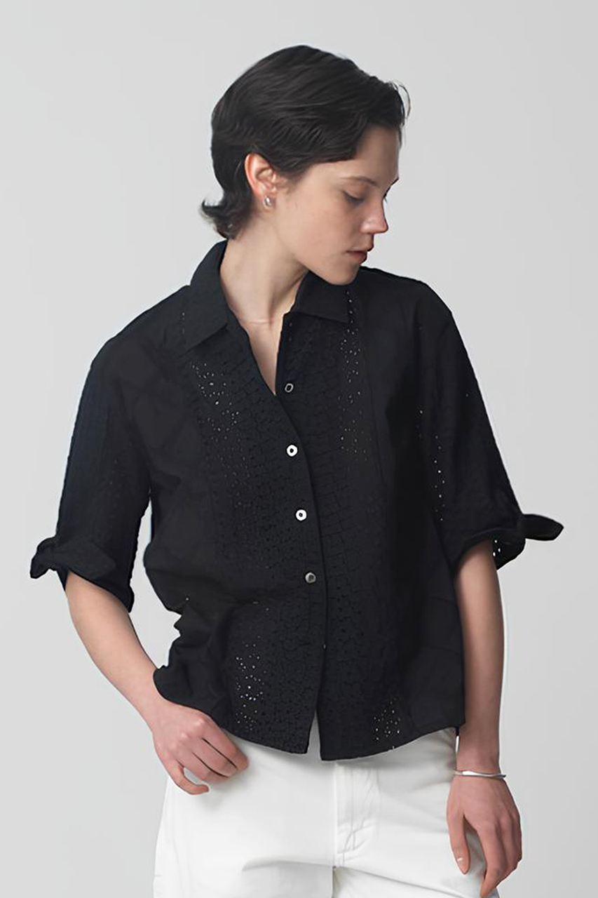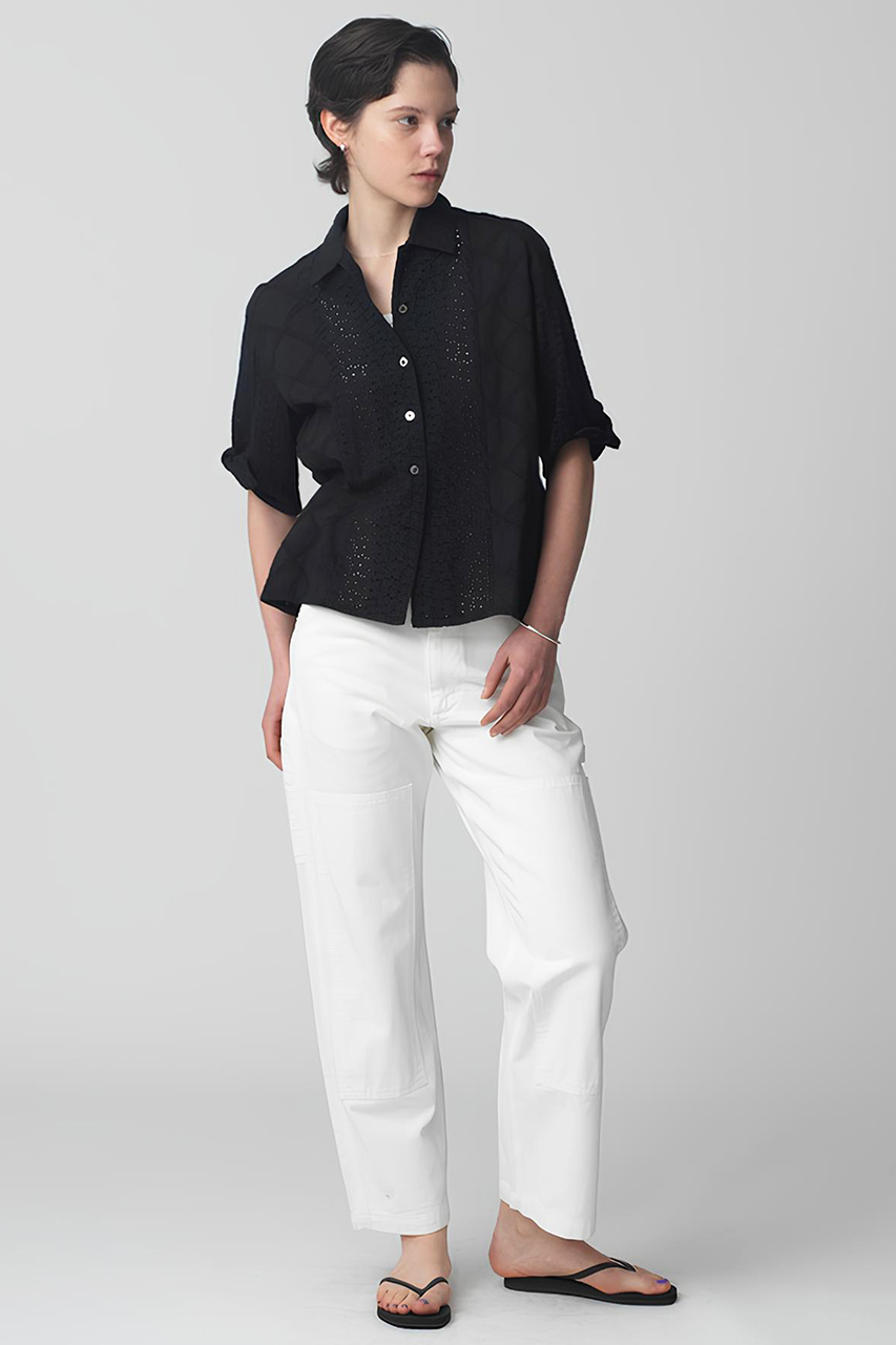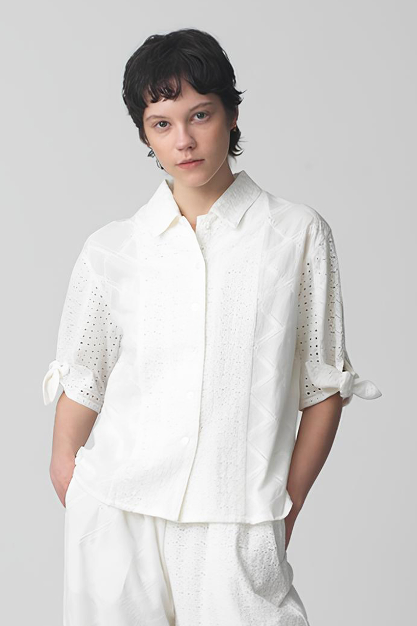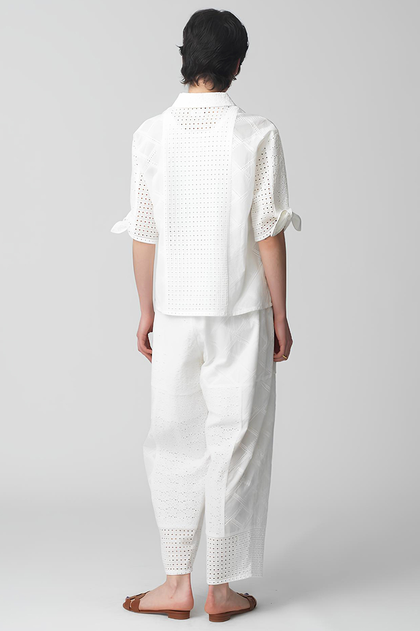 サンダルの足元が引き立つ3種類のカットワーク生地をパッチワークしたシャツ&パンツ。シャツは長めに調整された袖先についたリボンがポイントで、どんなボトム合わせでも好相性。パンツはボリューム感のあるバルーンシルエットで、スタイリングに華やかさをプラスしてくれます。セットアップでもスタイリングを楽しめる、初夏の装いにぴったりなアイテムです。