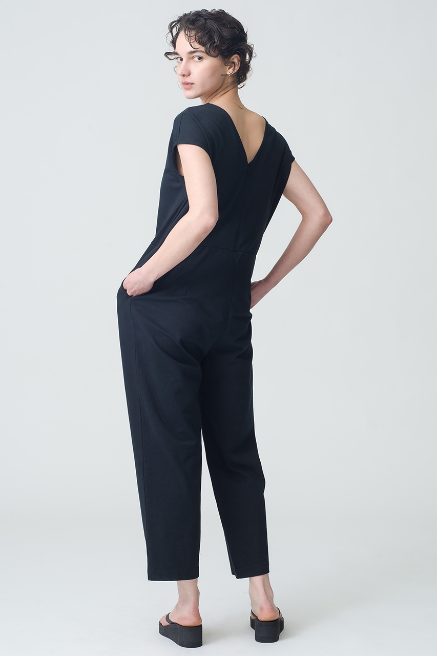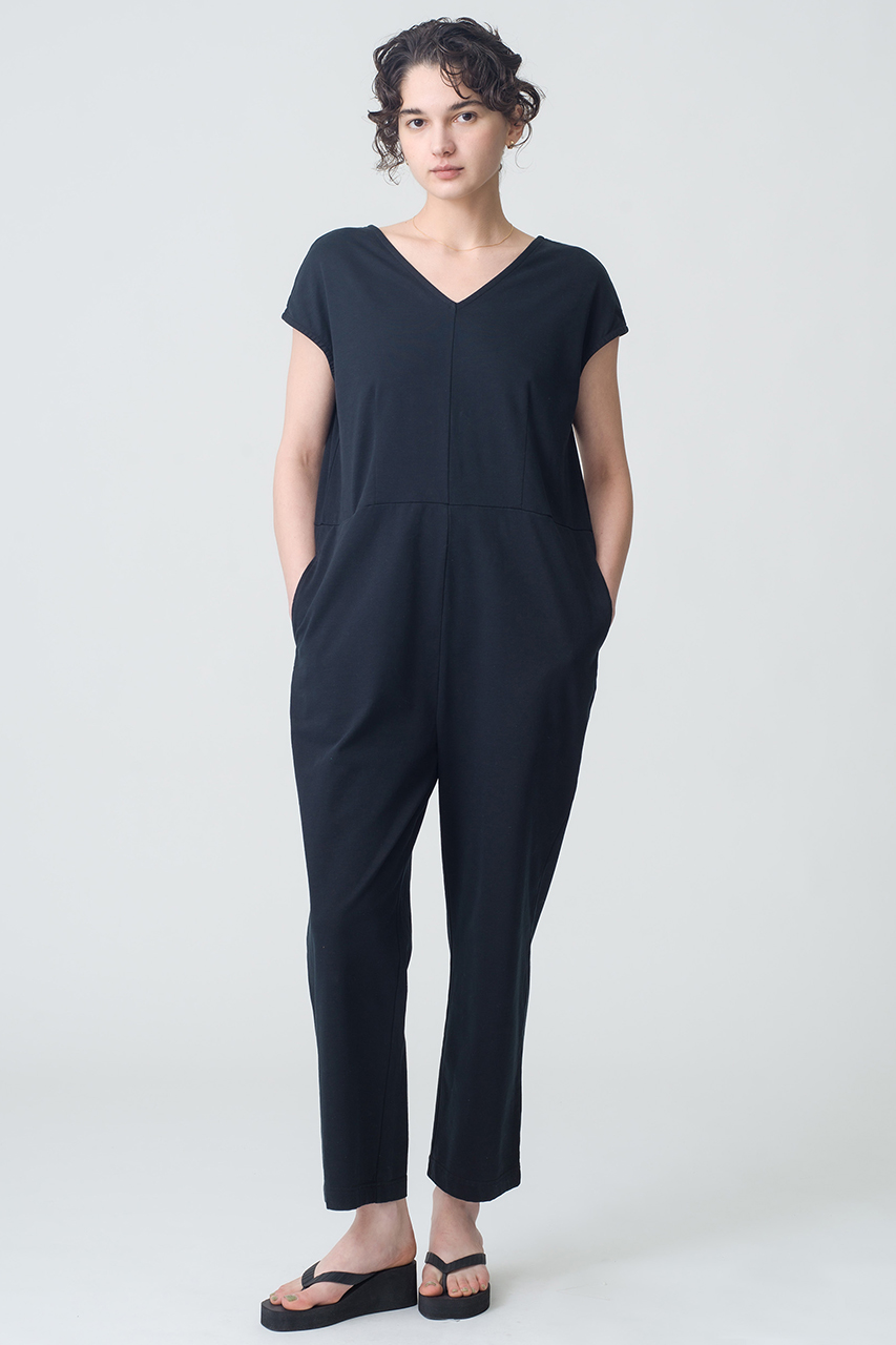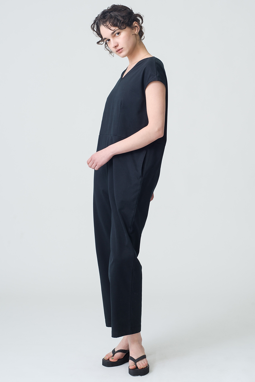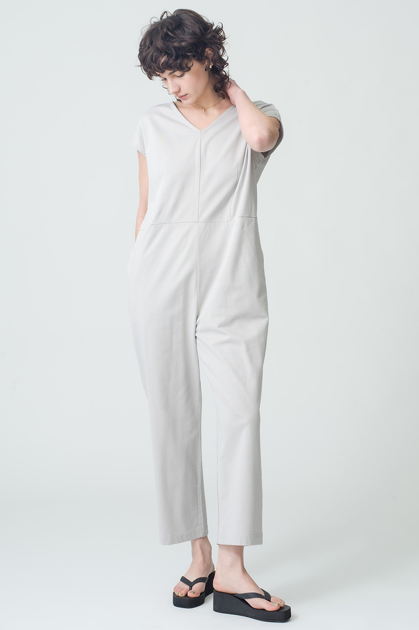 高密裏毛を使用した抜け感漂うジャンプスーツも要チェック。伸縮性抜群なカット素材は、真夏でもさらっと着られるのが嬉しい。V字に開いた前後のデザインがスタイリングに抜け感を。気になる二の腕周りをカバーしてくれるノースリーブ丈は、上品な大人カジュアルが叶います。上質なリラックススタイルが映える旅行やアウトドアシーンにも大活躍しそう。